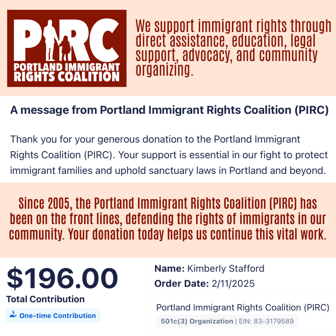 Thanks to a successful events at Portland Night Market & in Tigard this February, we were able to pass along over $400 to three incredible local organizations. PIRC (Portland Immigrant Rights Coalition) helps support the right of our immigrant neighbors.