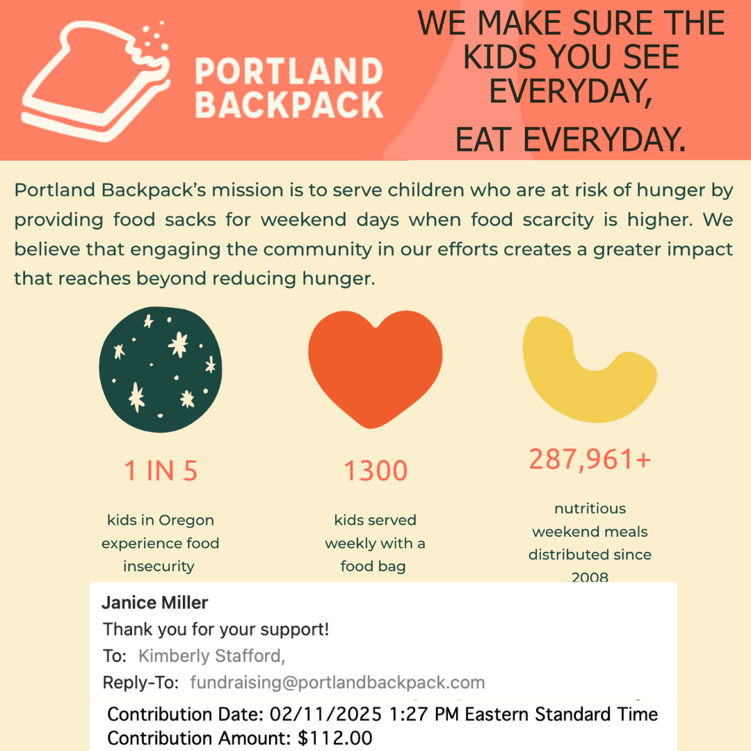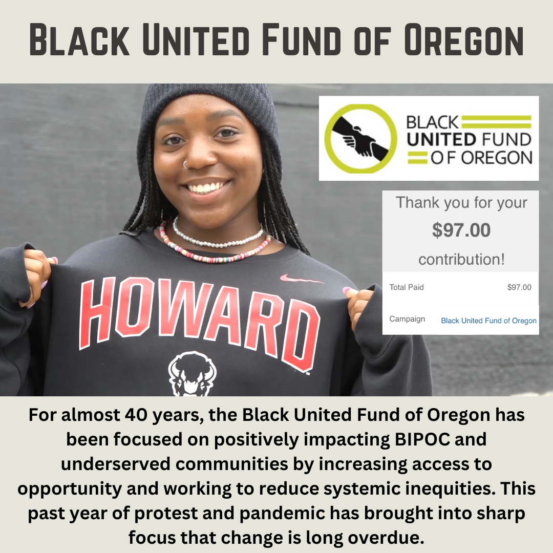 Portland really showed up for us in February, allowing us to send $400 to three nonprofits that help support our communities. Black United Fund helps our BIPOC youth access opportunities in schooling & the workplace and fights systems inequities.