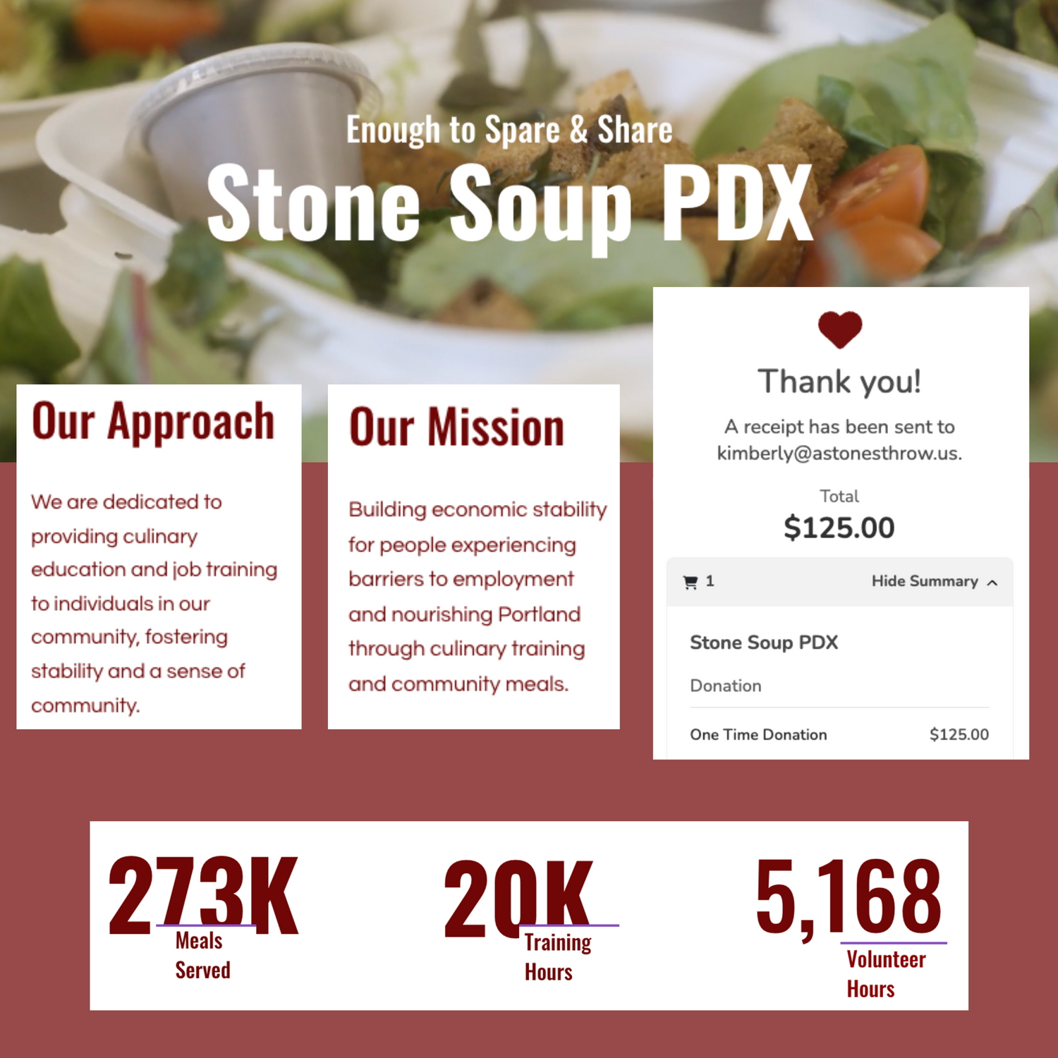 Stone Soup does meaningful work in our community for the individuals it trains and the meals it serves. We thank everyone who made this $125 gift possible by shopping with us at the Portland Bazaar and April's 1st Thursday in The Pearl.