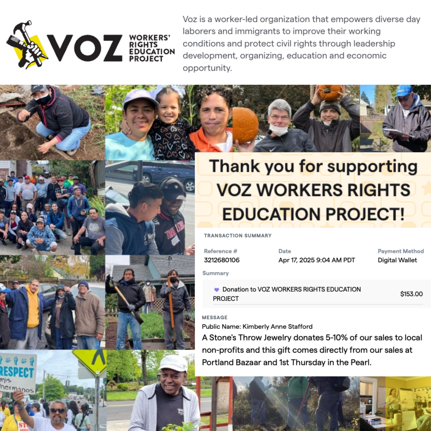VOZ helps protect the working conditions and civil rights of. our local day laborer community. We thank everyone who made this $153 gift possible by shopping with us at the Portland Bazaar and April's 1st Thursday in The Pearl.