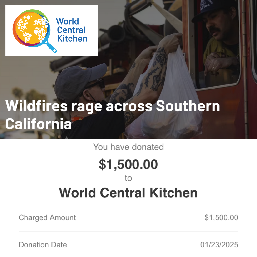 During our 4-week Los Angeles Wildfires Fundraiser, we sent more than $4,500 to three different non-profits. Pictured is one of our 3 donations to WCK which summed to $2,369, supporting their work to feed people impacted by the fires.
