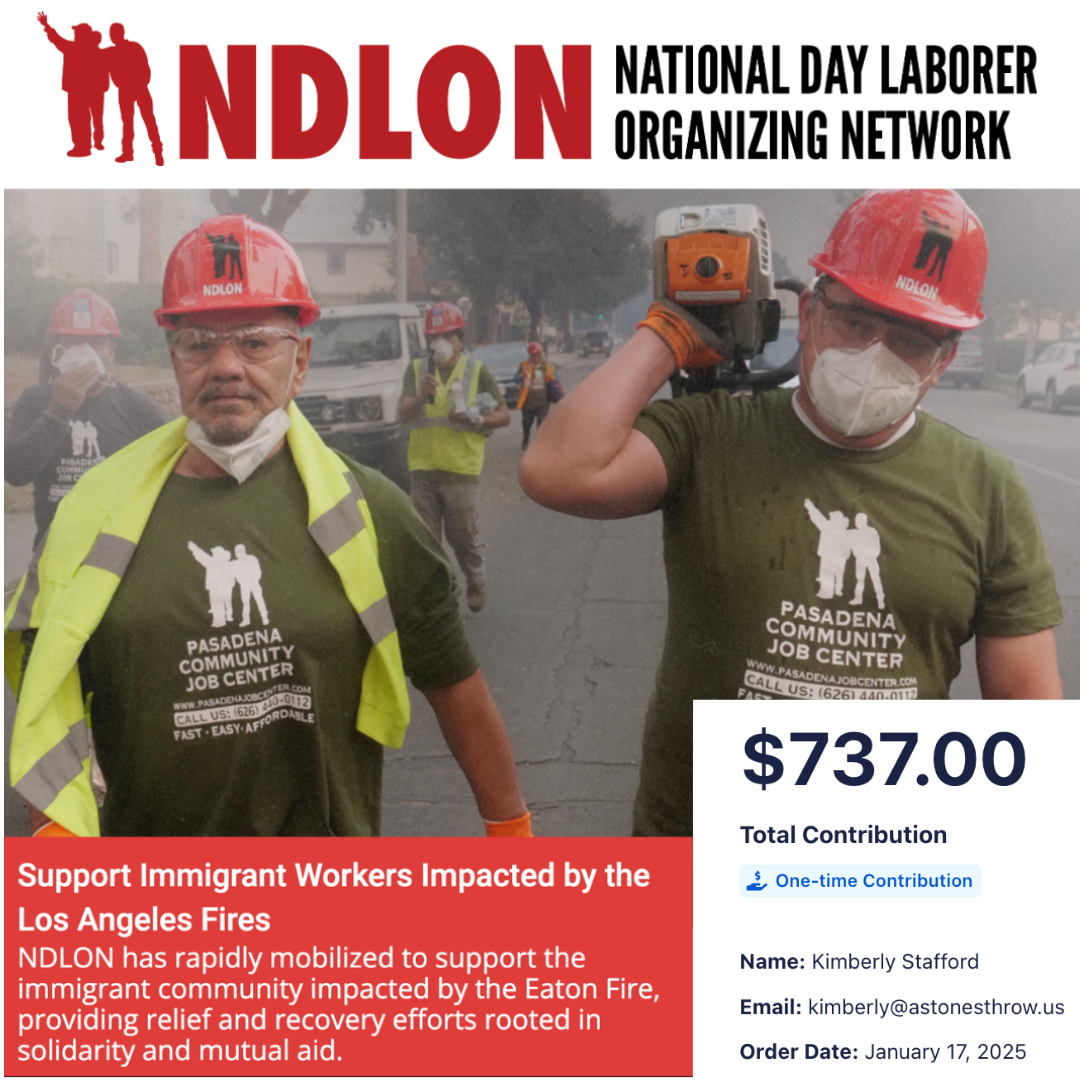 During our 4-week Los Angeles Wildfires Fundraiser, we sent more than $4,500 to three different non-profits. Pictured is one of our 3 donations to NDLON which summed to $1,634, supporting their advocacy work for undocumented community members in Los Angeles.