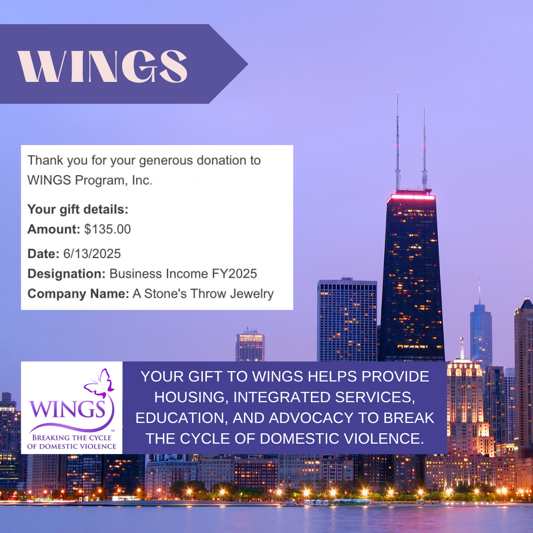 WINGS empowers survivors of domestic violence with tools and services that enable them to gain independence, breaking the cycle of abuse and trauma. This $135 gift is from our sales at the One Of A Kind Spring Show, April 25-27, 2025.