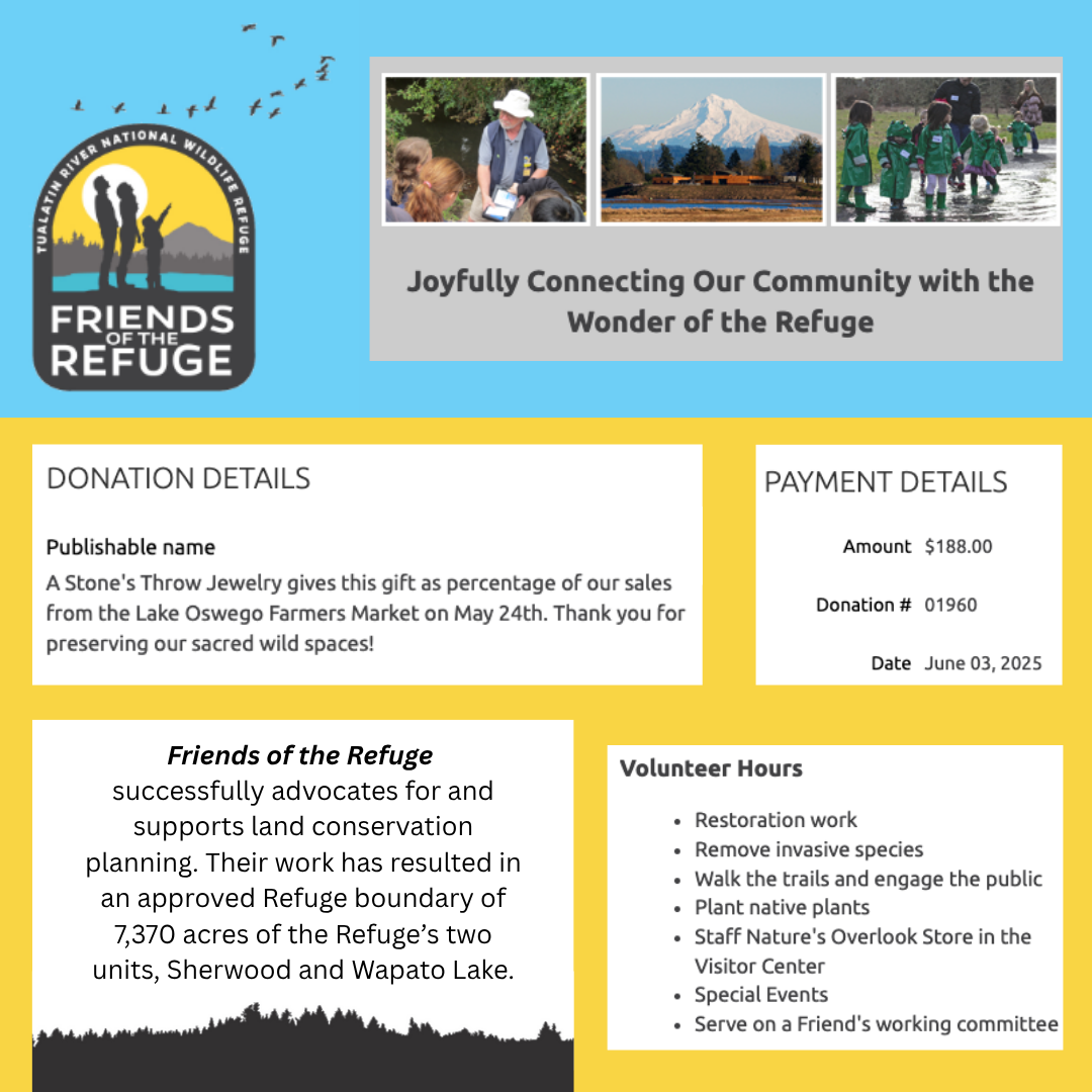 Friends of the Refuge successfully advocates for and supports land conservation planning. Their work has resulted in an approved Refuge boundary of 7,370 acres of the Refuge’s two units, Sherwood and Wapato Lake. This $172 gift came from our Lake Oswego Farmer's Market sales on May 24, 2025.