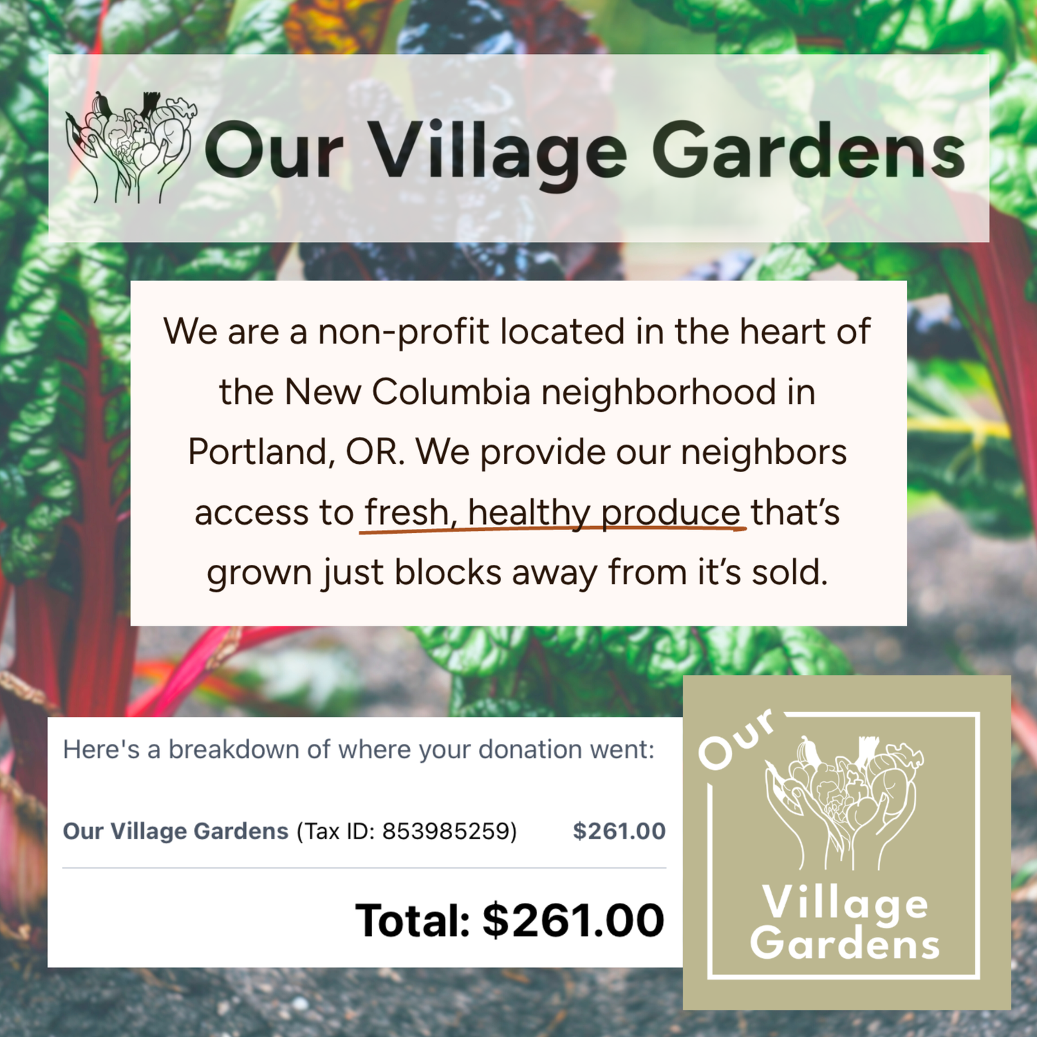 Our Village Gardens is a food justice nonprofit that serves our neighbors in Portland's largest affordable housing community in North Portland on Columbia Blvd. This gift is from our sales at the NW Marine Art Works Summer 2025 Open Studios.