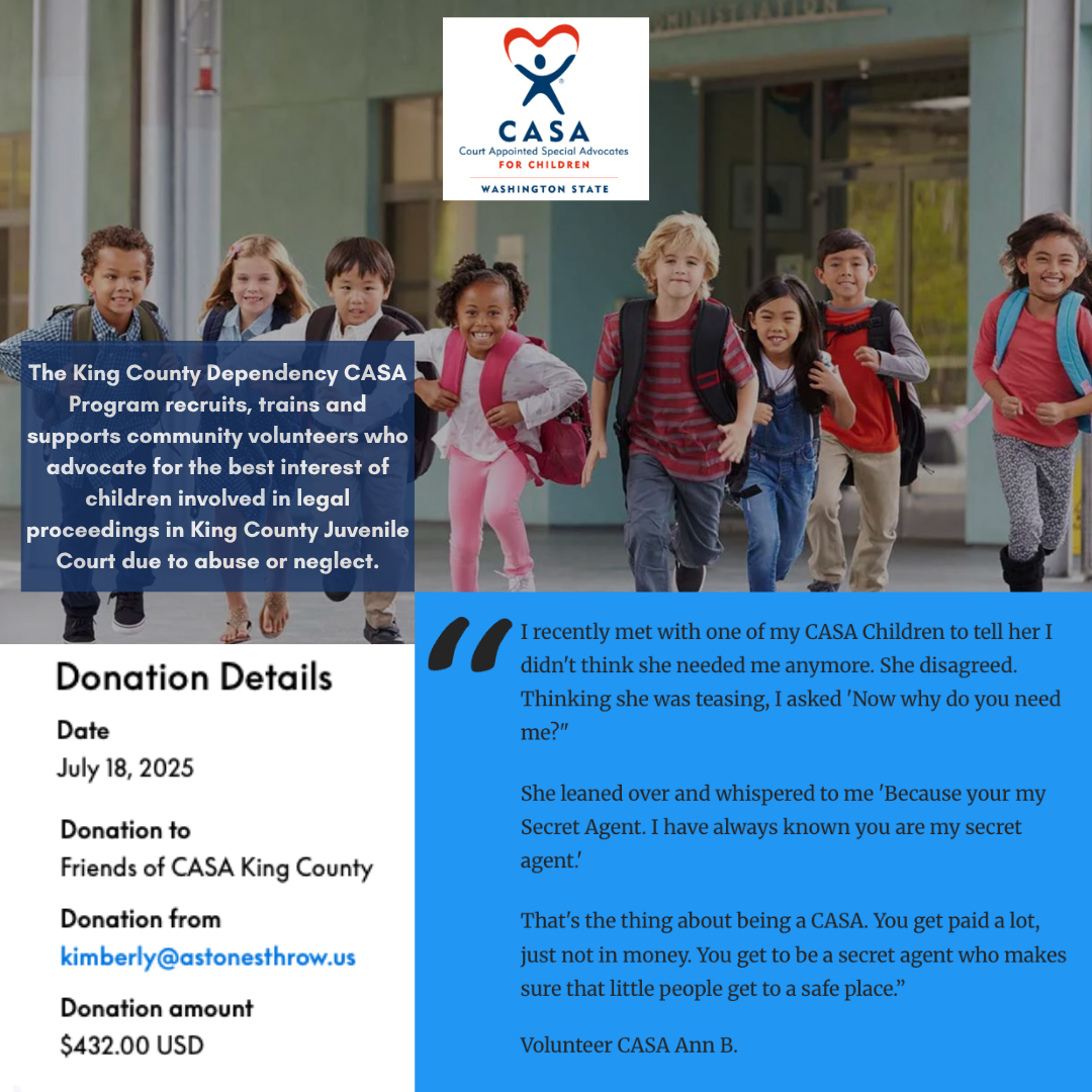 CASA volunteers work tirelessly to support children who have experienced abuse and neglect and are going through the trauma of the court system. This donation is from our weekend West Seattle Summer Fest where clients helped us send more than $1k to ReWA and King County CASA.
