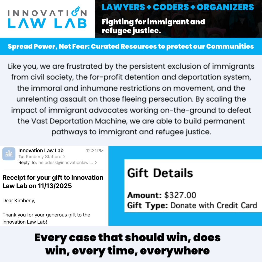 The U.S. government’s detention + deportation machine is attacking the spirit of our immigrant neighbors by tearing apart communities and separating families. Innovation Law Lab offers legal advocacy & support to our refugee + immigrant community members and we are proud to support them with this donation from our August + September events.