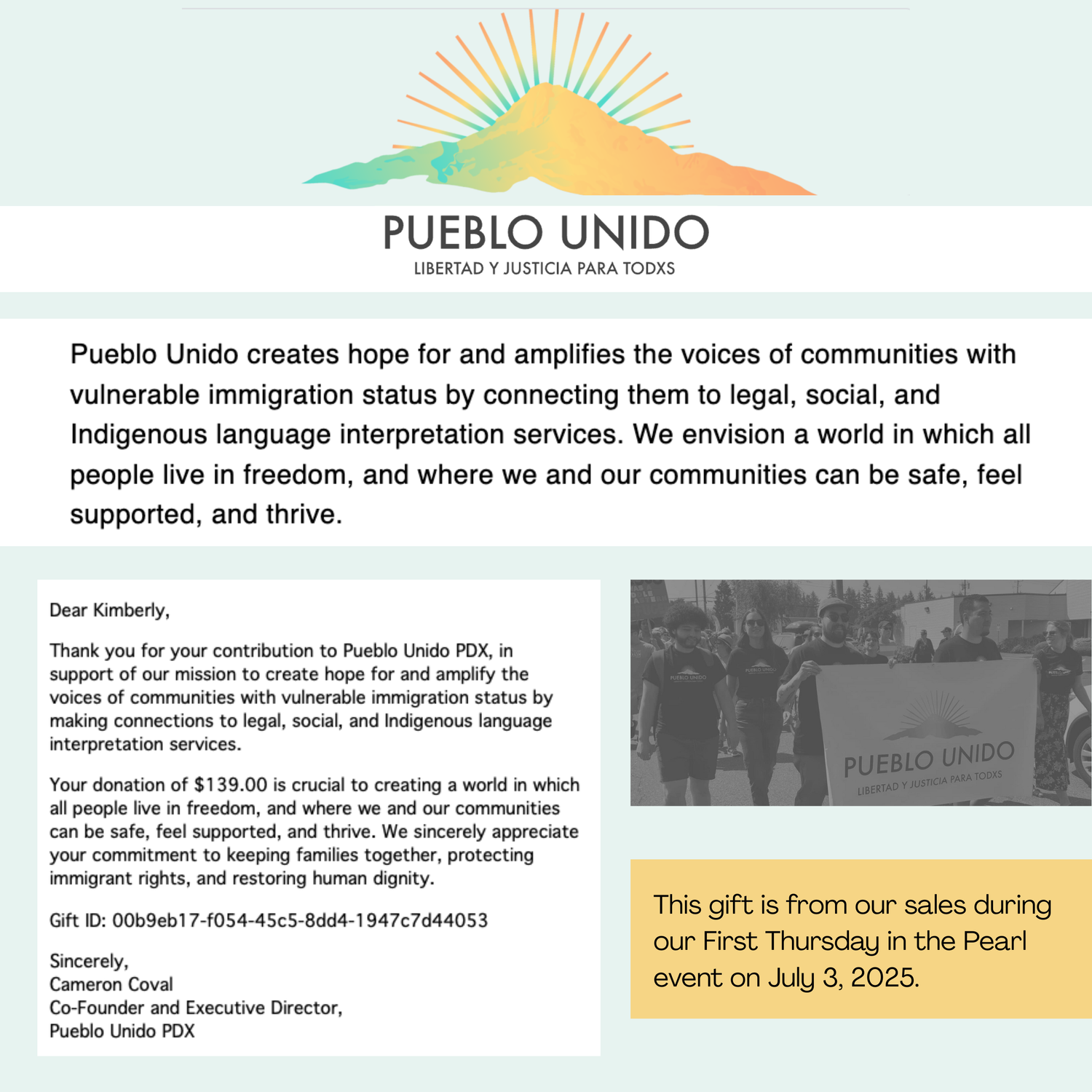 Pueblo Unido addresses long-standing inequities and promotes social inclusion by helping people with a vulnerable immigration status overcome financial, technological, literacy, linguistic, and bureaucratic barriers to essential human rights and services. This gift is from July's FIrst Thursday in the Pearl, 2025.