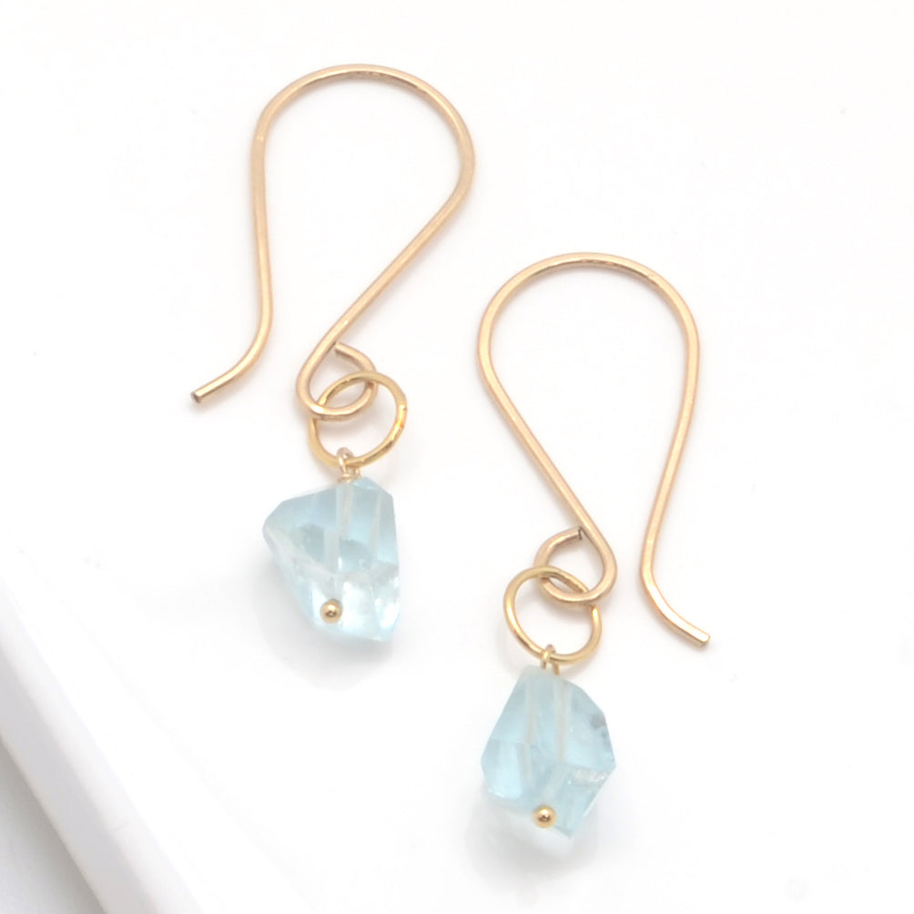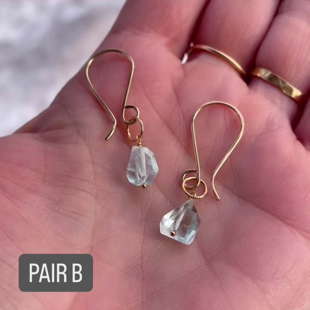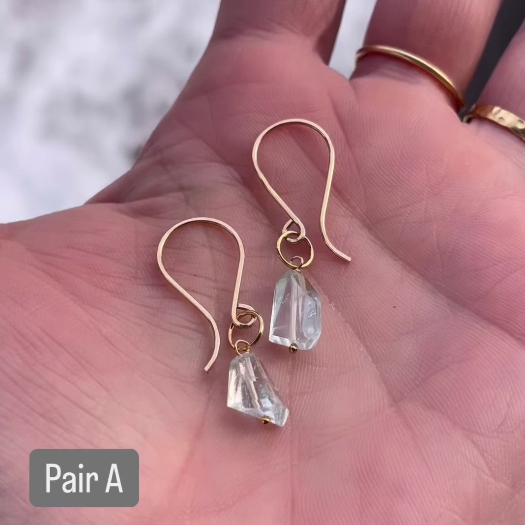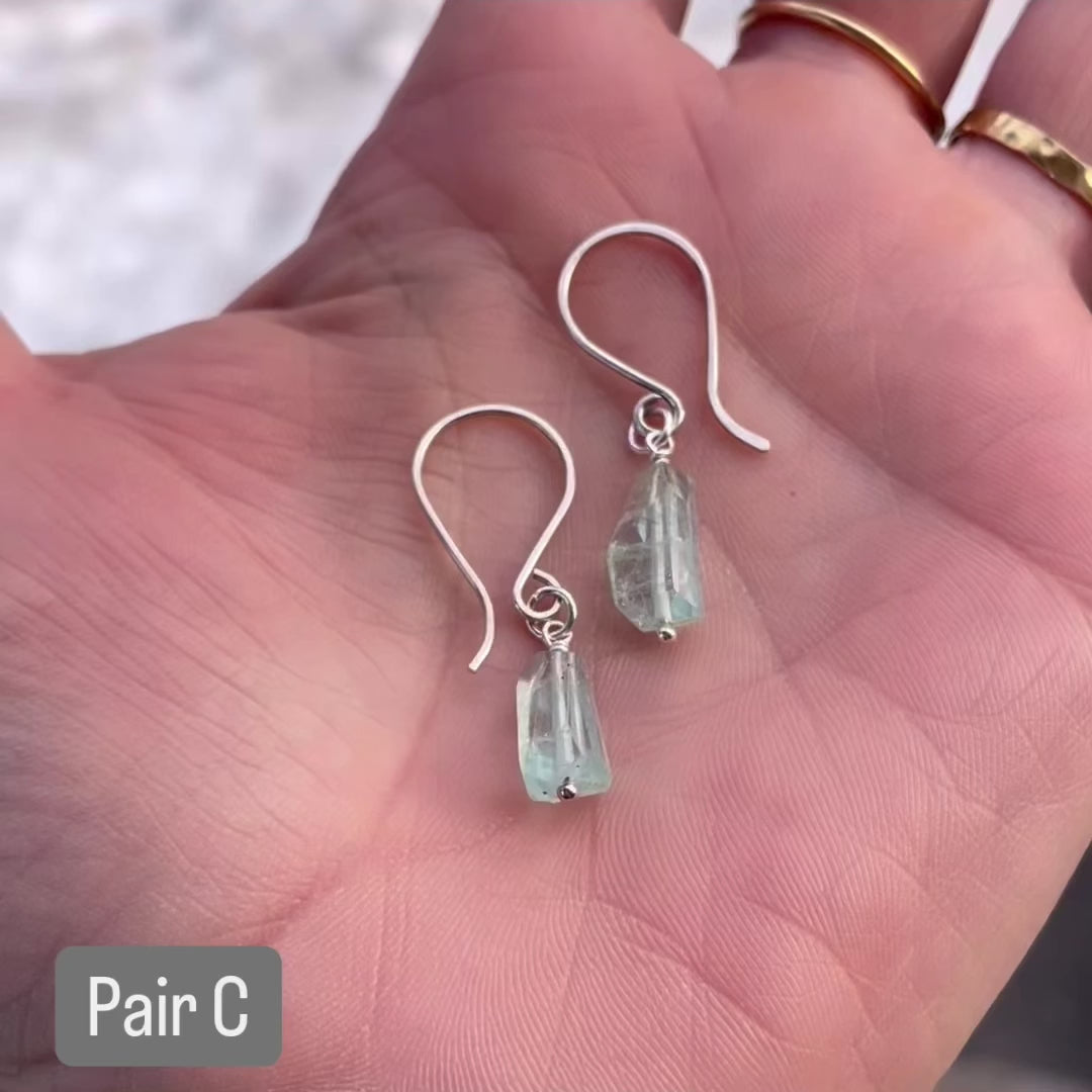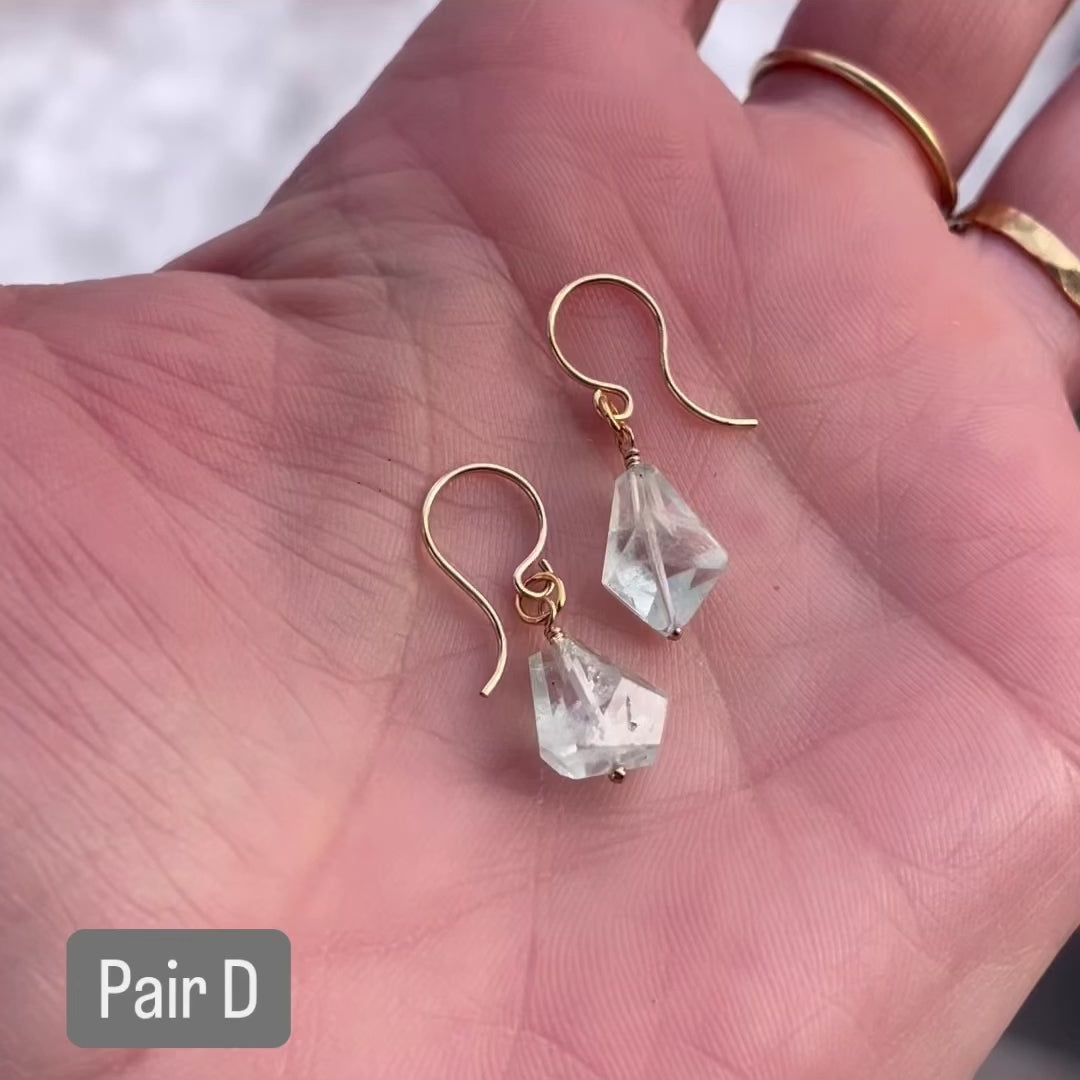 We love the celestial blue clarity of these asymmetric Aquamarine Nuggets. Each pair is fantastically-faceted and unique. Pairs A, B, and C are on our hand-crafted Low Swoop earwires for a slightly more dramatic effect. Pair D is on our shorter, standard earwires, for a more understated mood.