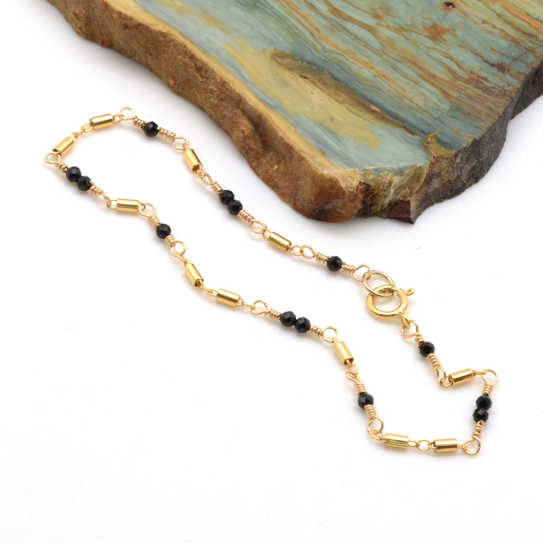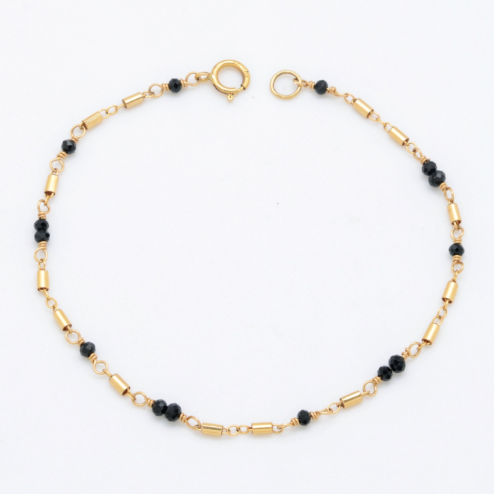 Our Barrel of Laughs Bracelet features faceted Black Spinel gemstones asymmetrically dotting our 14k Gold Filled Barrel chain. It is light enough to not interfere with your daily routine, but striking enough to give an elegant accent.