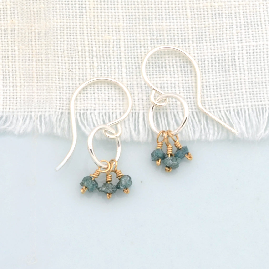 Raw Diamonds are unique, enduring, and perfect in their imperfection. Each tiny precious Raw Diamond has a mysterious shimmer and a subtle, but sophisticated beauty. Here a cluster of 3 Raw Blue Diamonds dances on Sterling Silver or 14k Gold Filled Hammered Hoops and earwires, making these a playful yet sophisticated everyday option. (Please note, each Raw Diamond varies from the next, but on average these Diamonds measure approximately 2mm wide by 3-4mm in length.)