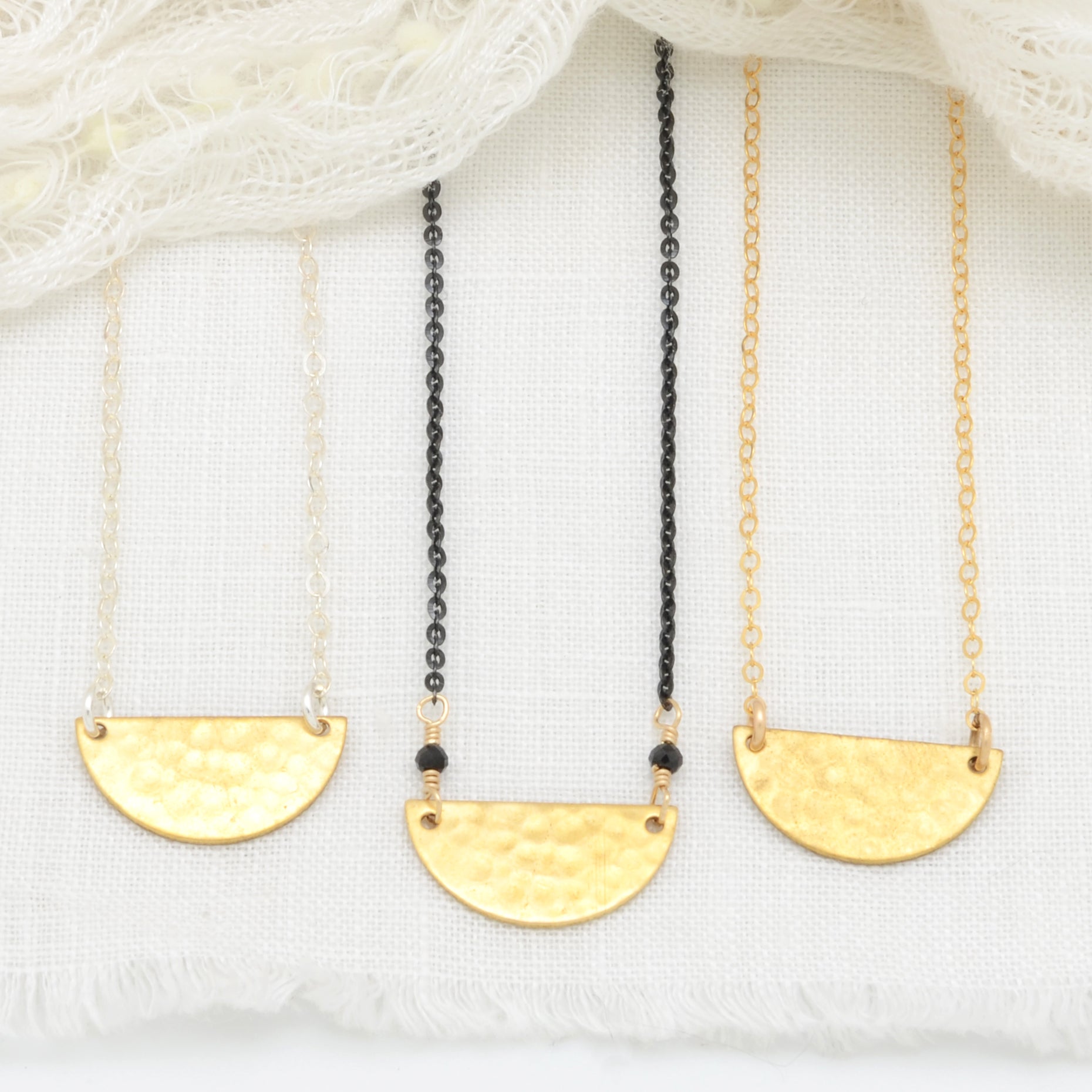 These hammered Brass Half Moons are 3/4" across and are offered on Sterling Silver, 14k Gold Filled, or Oxidized Silver Gunmetal chain. These are cute on their own, or can be layered with other chains.