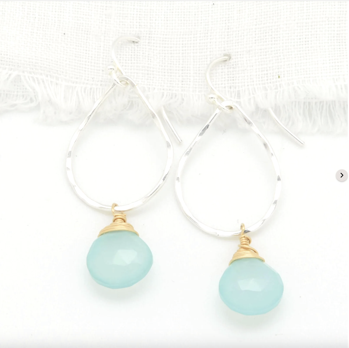 Sea-glass-blue Chalcedony, set on Sterling Silver or 14k Gold Filled Hand-Hammered 1" Tears. Not only is Chalcedony the perfect gem for beachcombers, but it is also said to absorb negative energy while promoting a sense of peace & joy.