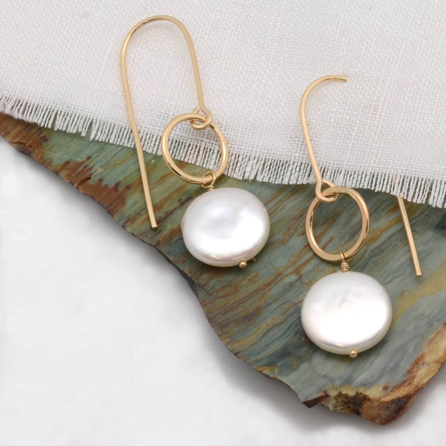 We love blending classic and modern... Gorgeous White Biwa Coin Pearls shown here on our hand-crafted 14k Gold Filled U-turn earwires. 2" in total drop length.
