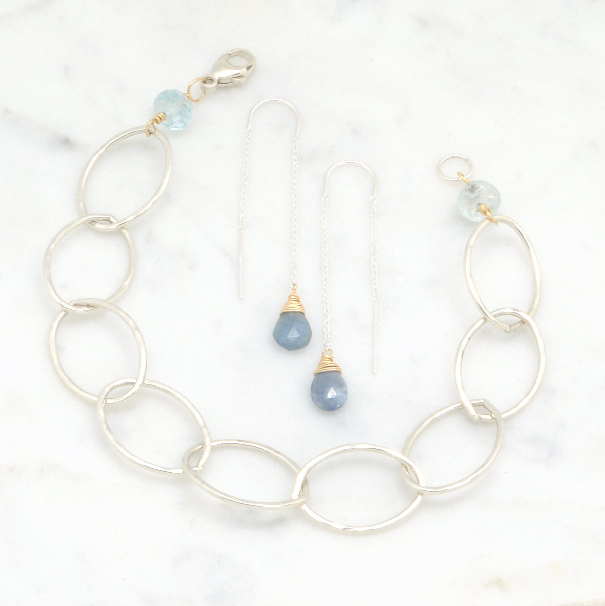 Shown here with our ICE bracelet, of Sterling Silver hand-hammered links with Aquamarine accents.