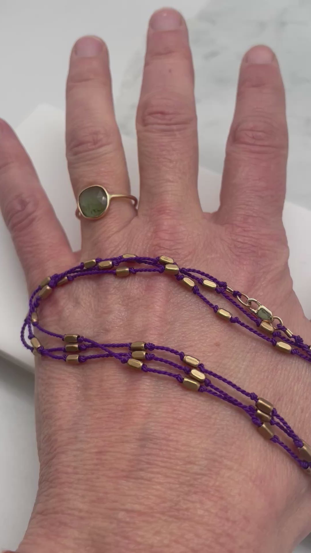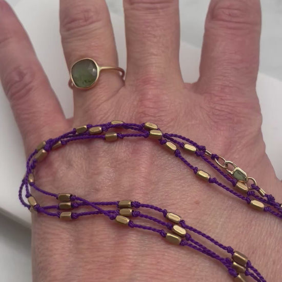 This Vikings-Inspired "Down to Brass Tacks" is done in deep Purple Silk for sports-or-purple-enthusiasts alike! 💜 Hand-knotted on bright purple silk, these hand-cut solid brass beads are finished with a 14k Gold Filled clasp.