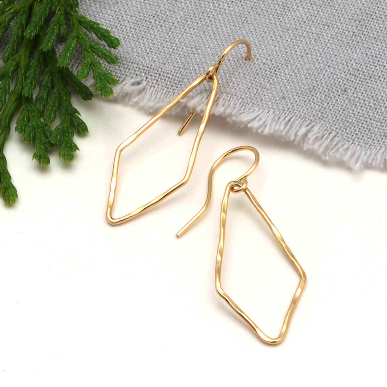 These Hand-hammered Kites in 14k Gold Filled are a perfect pair of casual everyday earrings. Light and easy to wear, but eye catching enough to not go unnoticed. 1.5" in total length. Also available in Sterling Silver, but not pictured here.