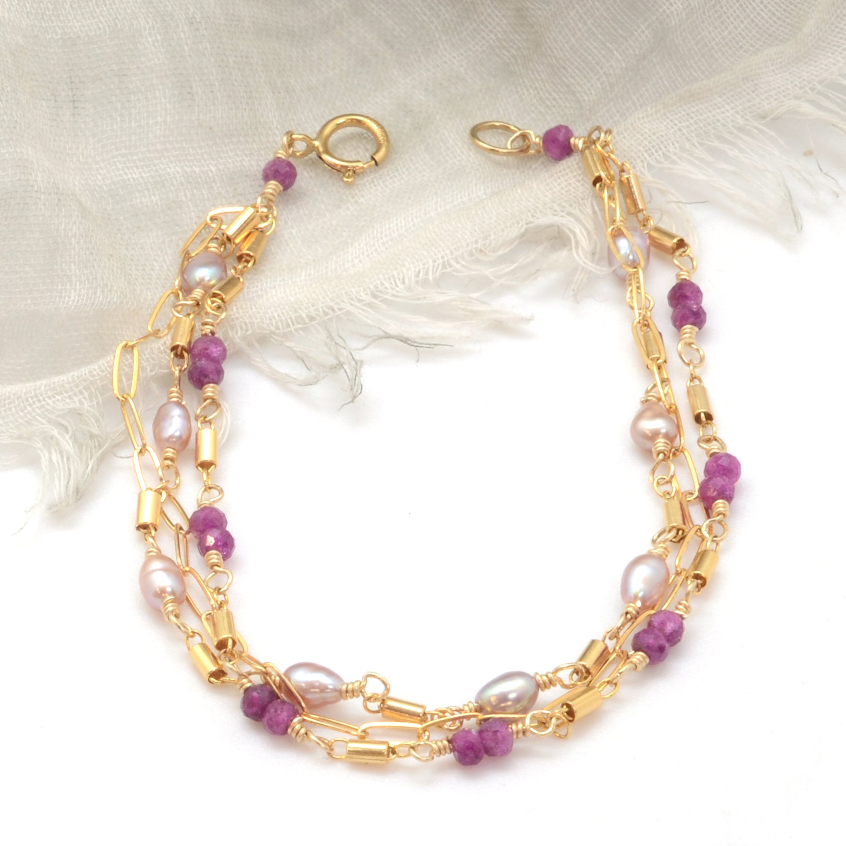 This is our first Triple Strand bracelet which was born through a request from a client who wanted to combine Mother + Daughter gemstones of June (Pearl) and July (Ruby) birthdays for a special Mother's Day gift. We thought it was was beautiful evough to add to our collection!