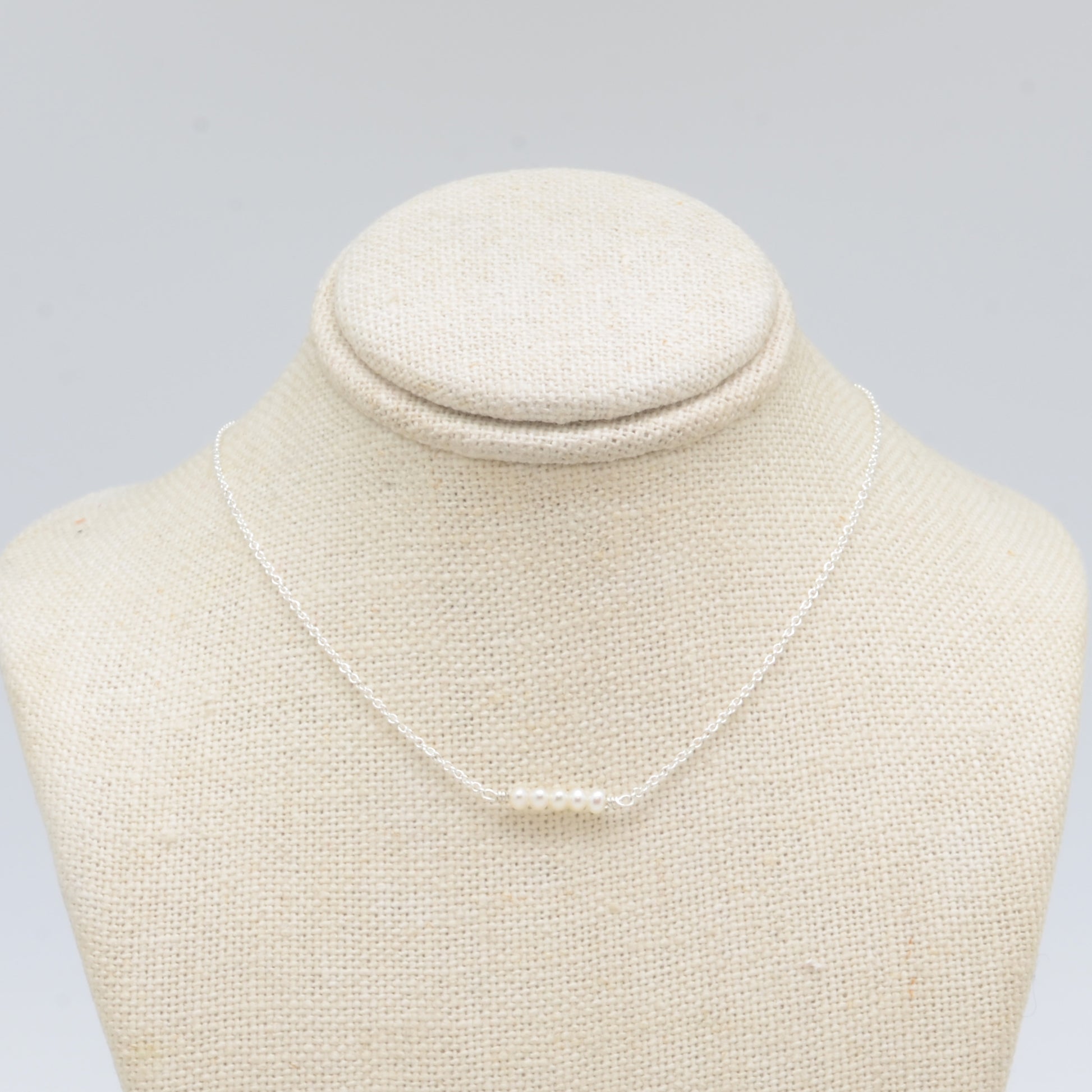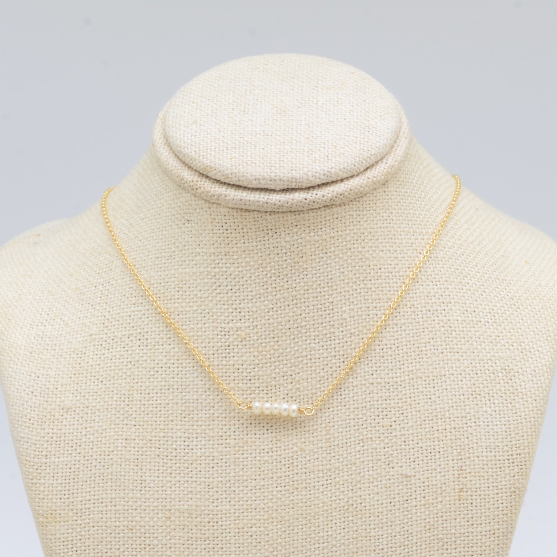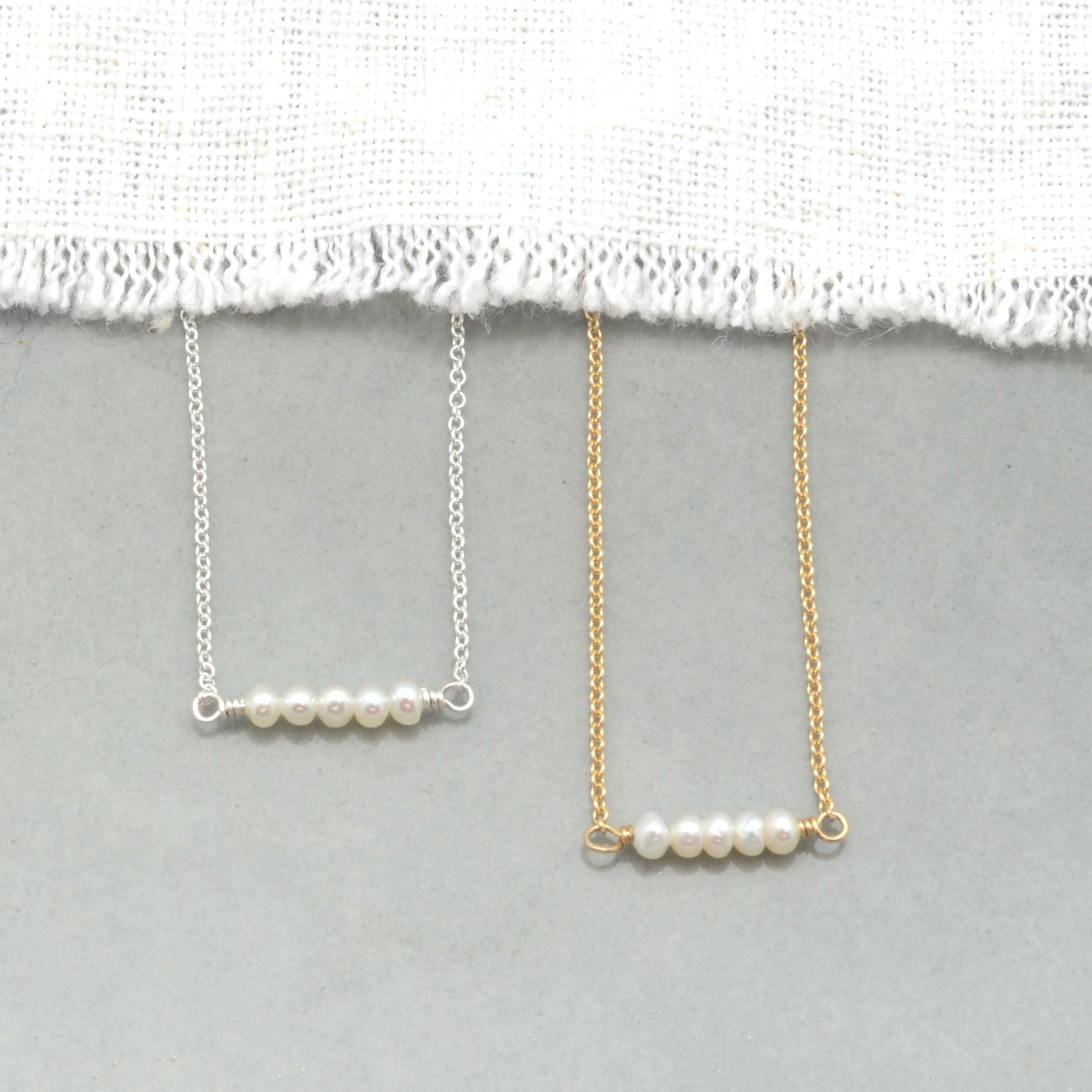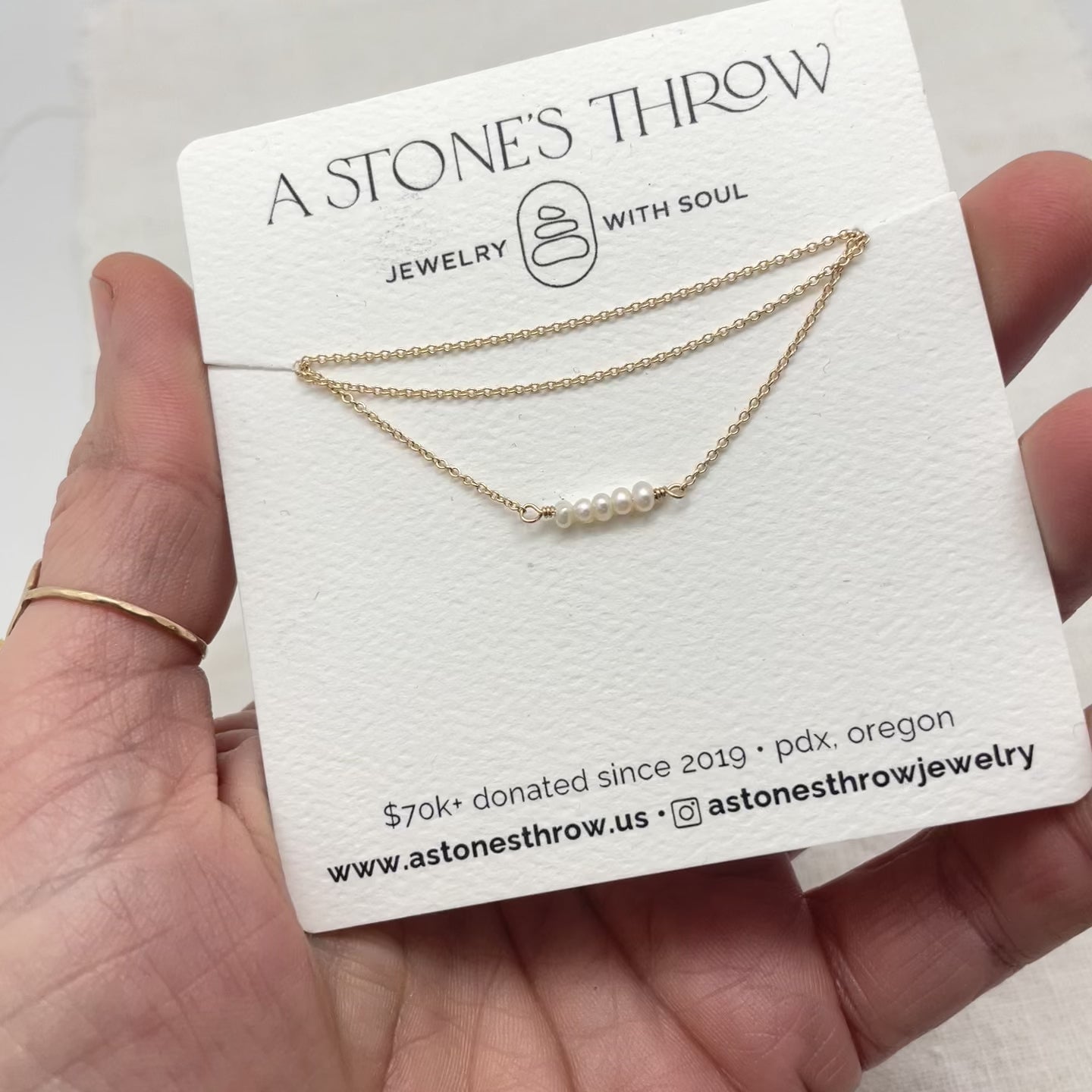 Available in 14k Gold Filled or Sterling Silver, our Gimme 5 Pearl necklace is also pictured here with Pearl Wynner Earrings, which were included in our in our Los Angeles Wildfires Fundraiser Collection.