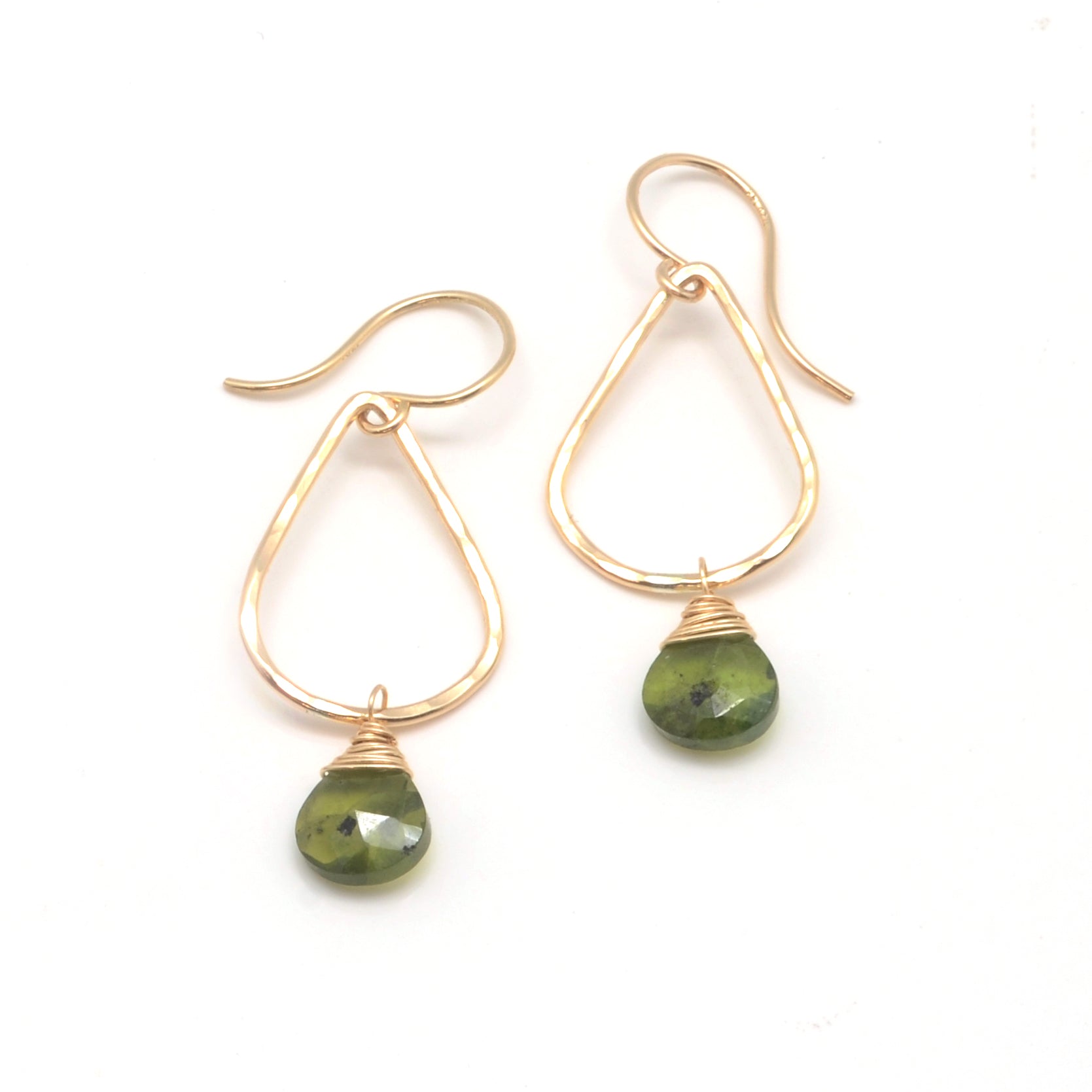 Garnet is believed to bring happiness, stop negative thinking, and attract good luck in the love and friendship department. These Tiny Green Garnet tears have beautiful little flecking in them and are set on 3/4" hand-hammered tears. Shown in 14k Gold Filled, but also available in Sterling Silver.