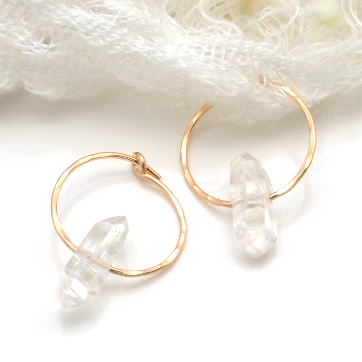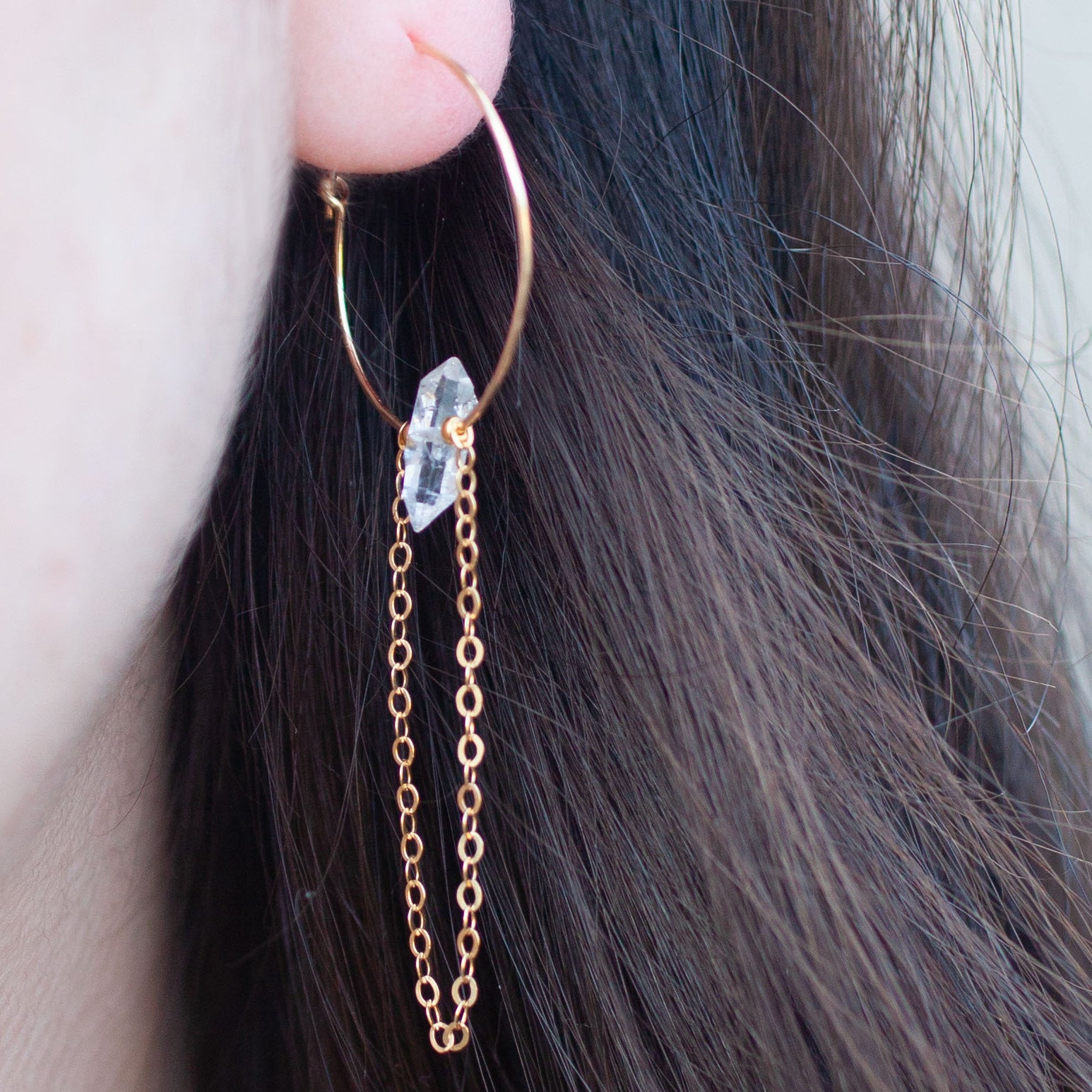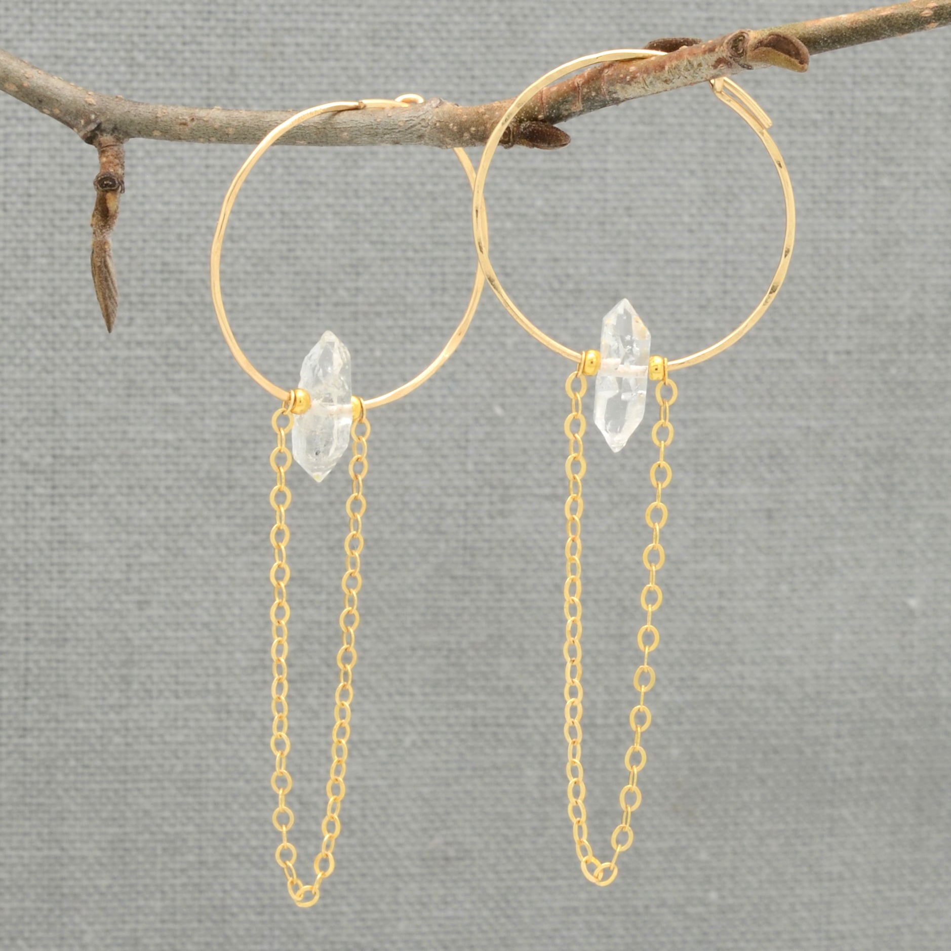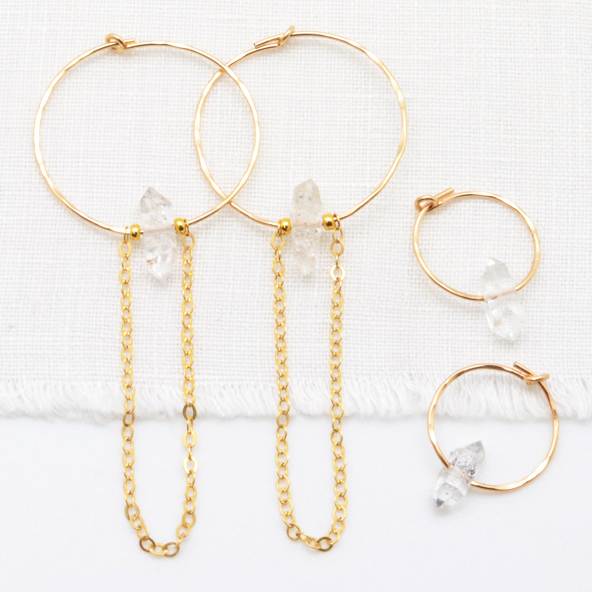 The larger ones are 1" hoops with a 1'5" drop of chain, so the total drop is 2.5". These smaller ones are our tiny 5/8" hoops. Each pair has set of Herkimer Diamonds.