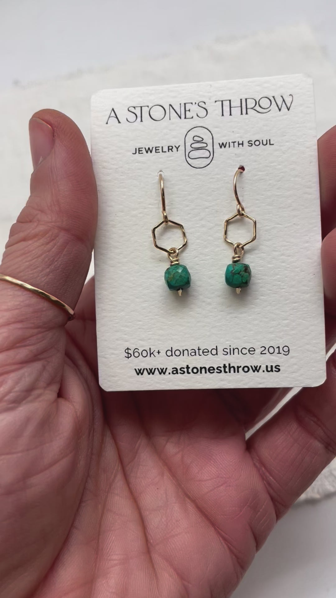 Available in 14k Gold Filled or Sterling Silver, our Hexy Wynner earrings, are also pictured here our Kara Turquoise necklace and our Turquoise Threaders, which were both included in our Los Angeles Wildfires Fundraiser Collection.