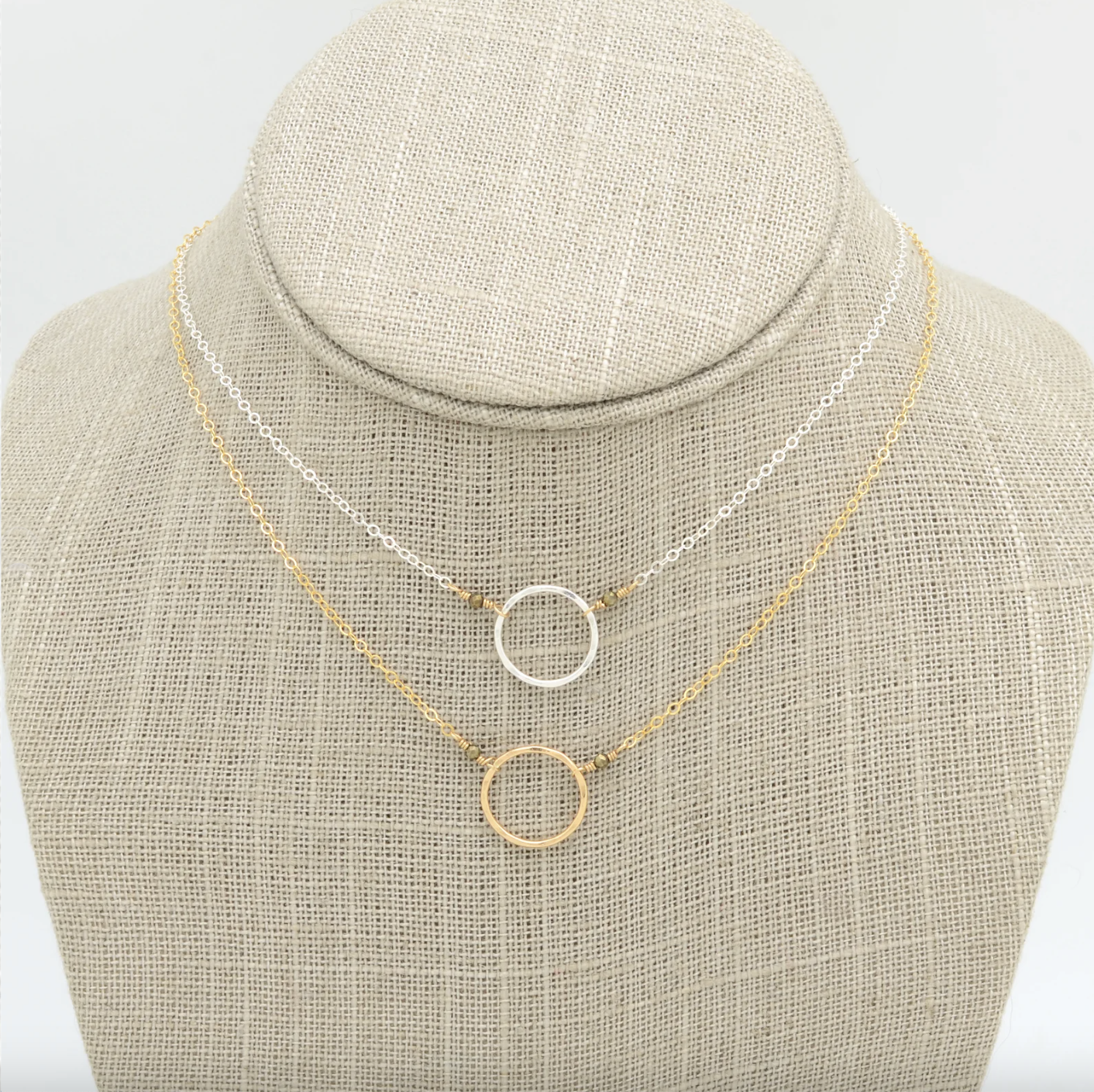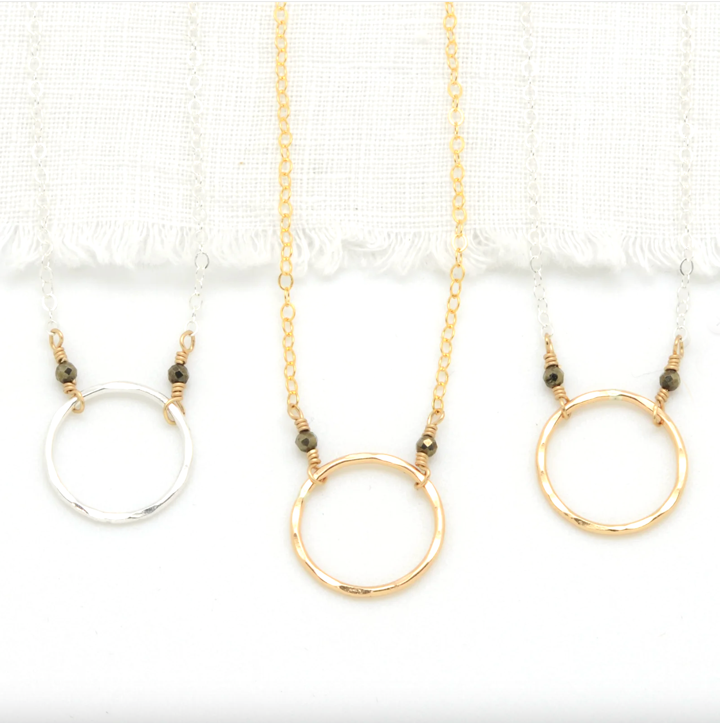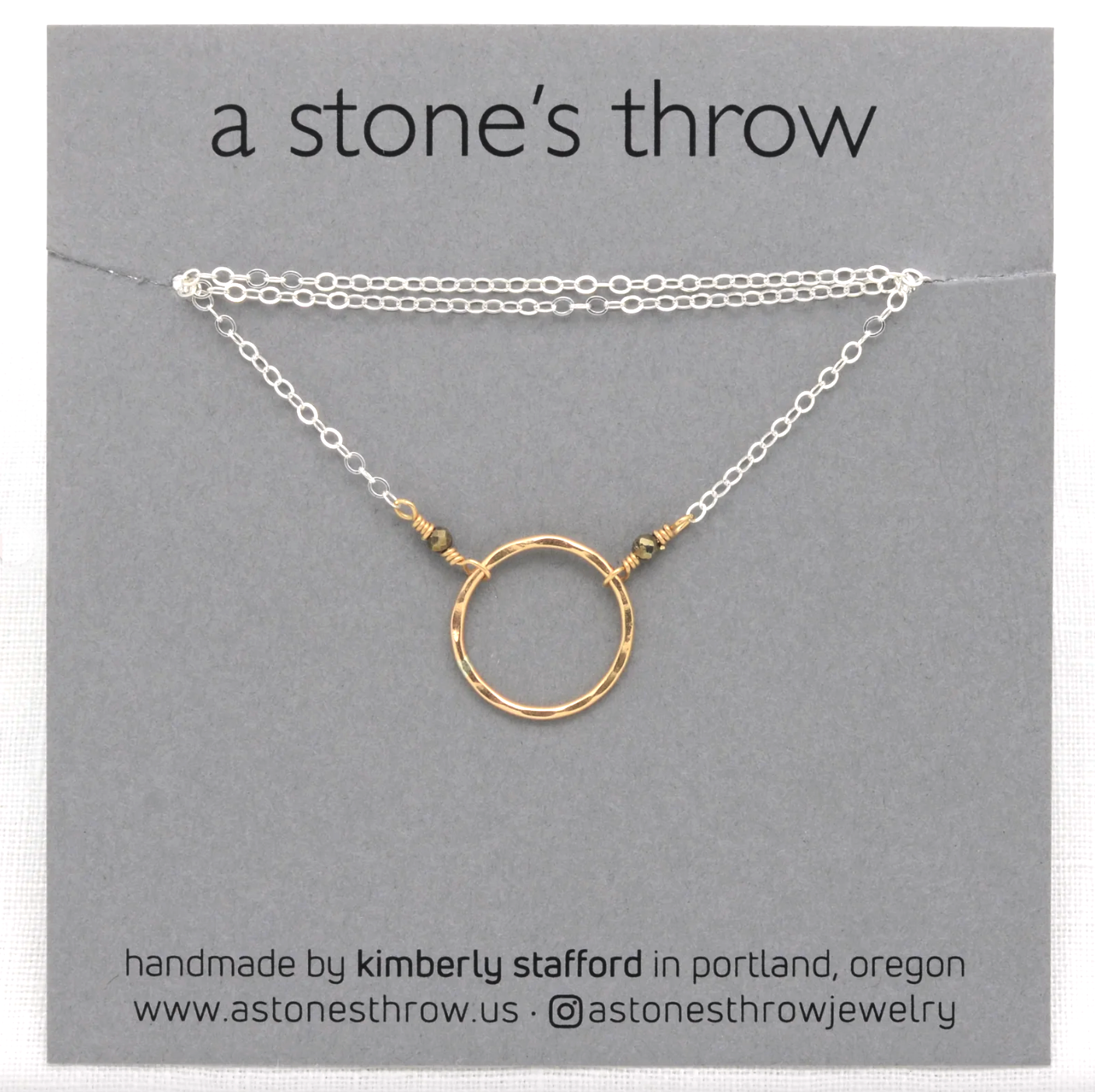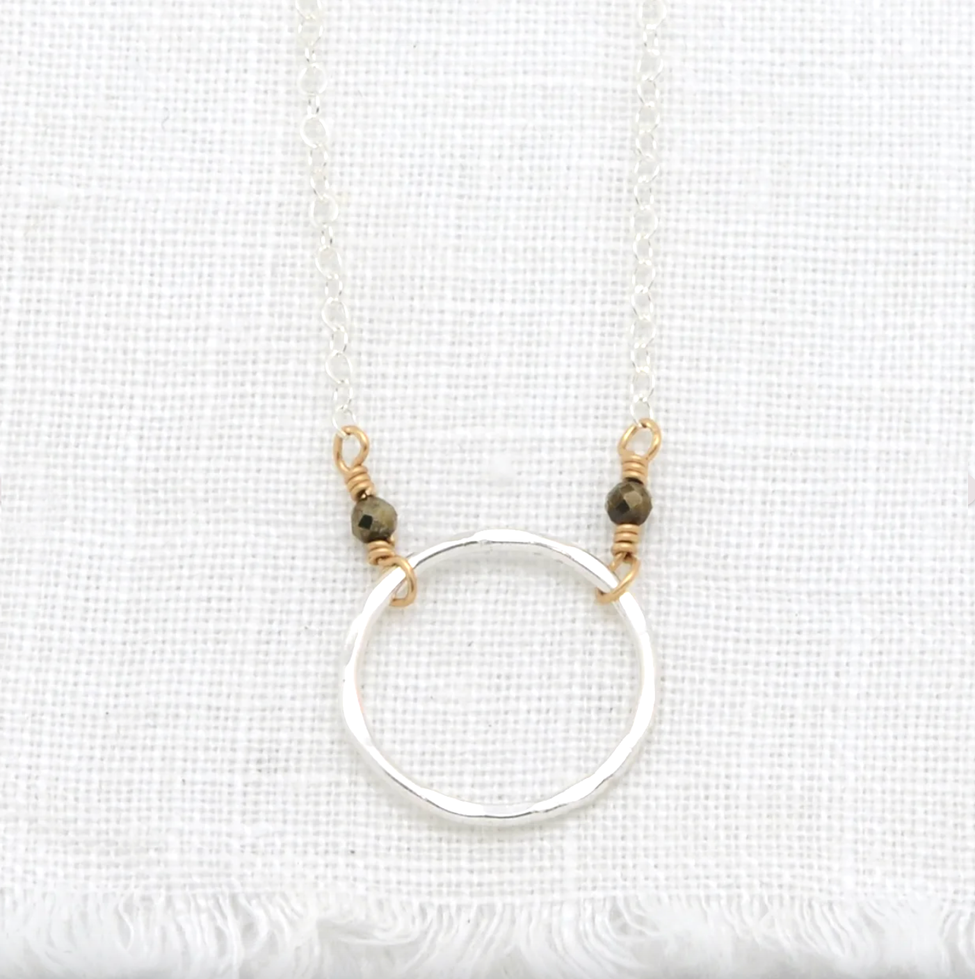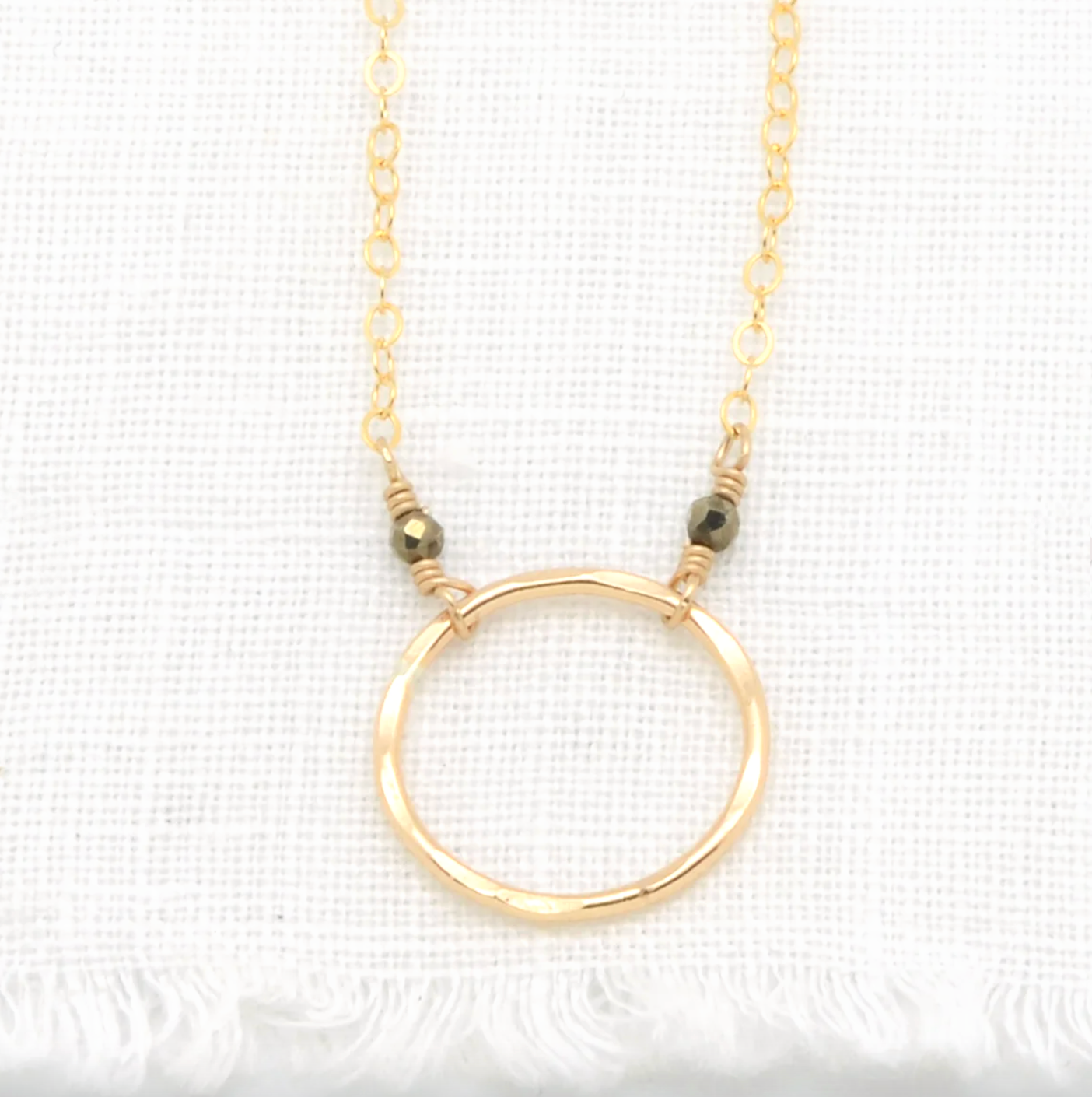 14k Gold Filled or Sterling Silver Hand-hammered 5/8" Circle on 14k Gold Filled or Sterling Silver Link Chain with metallic olive-green Pyrite Accents.
