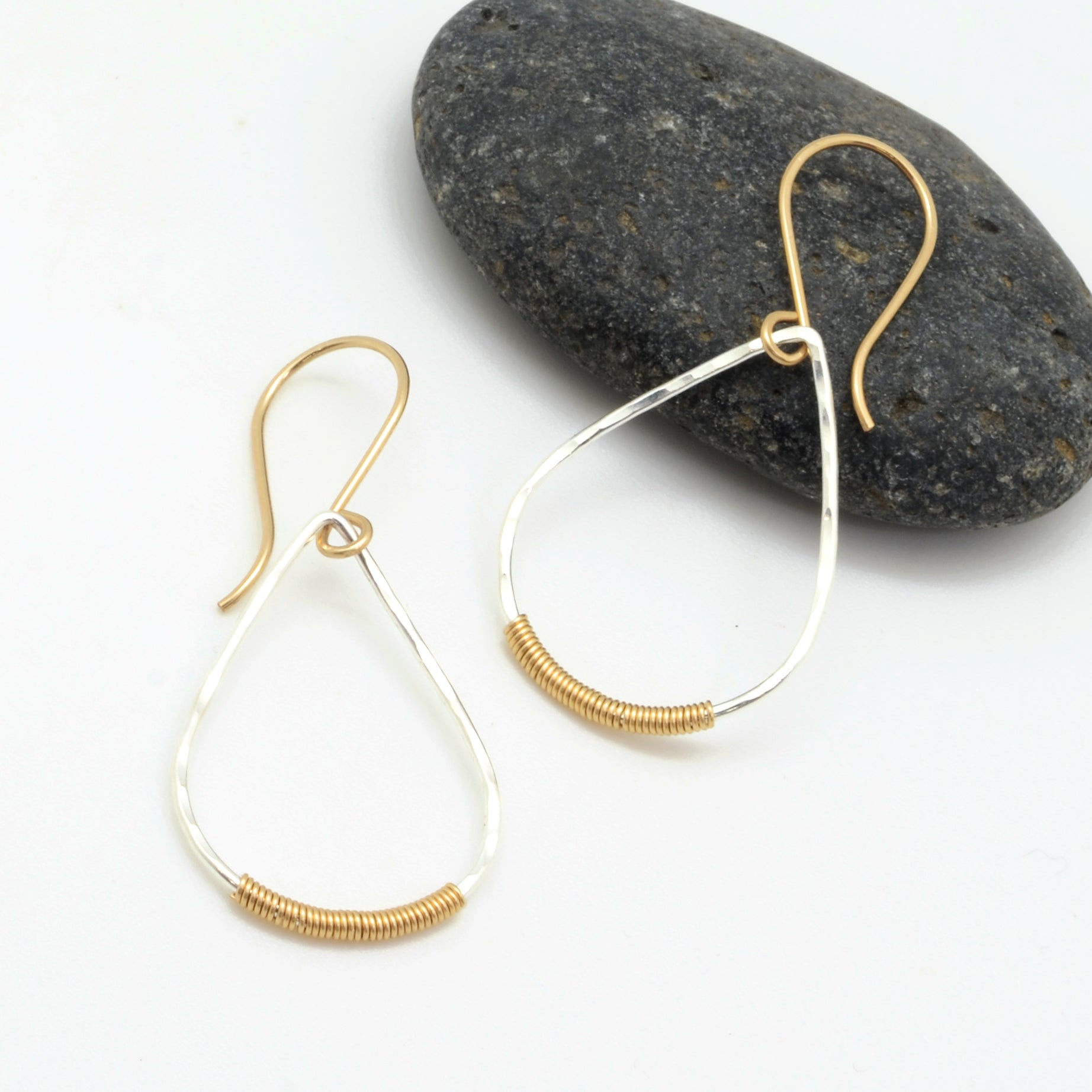 In our It's a Wrap collection, 14k Gold Filled wire is carefully wound around Sterling Silver hoops, tears, and povals (pointed ovals). We finish this collected with hand-crafted 14k Gold Filled earwires.