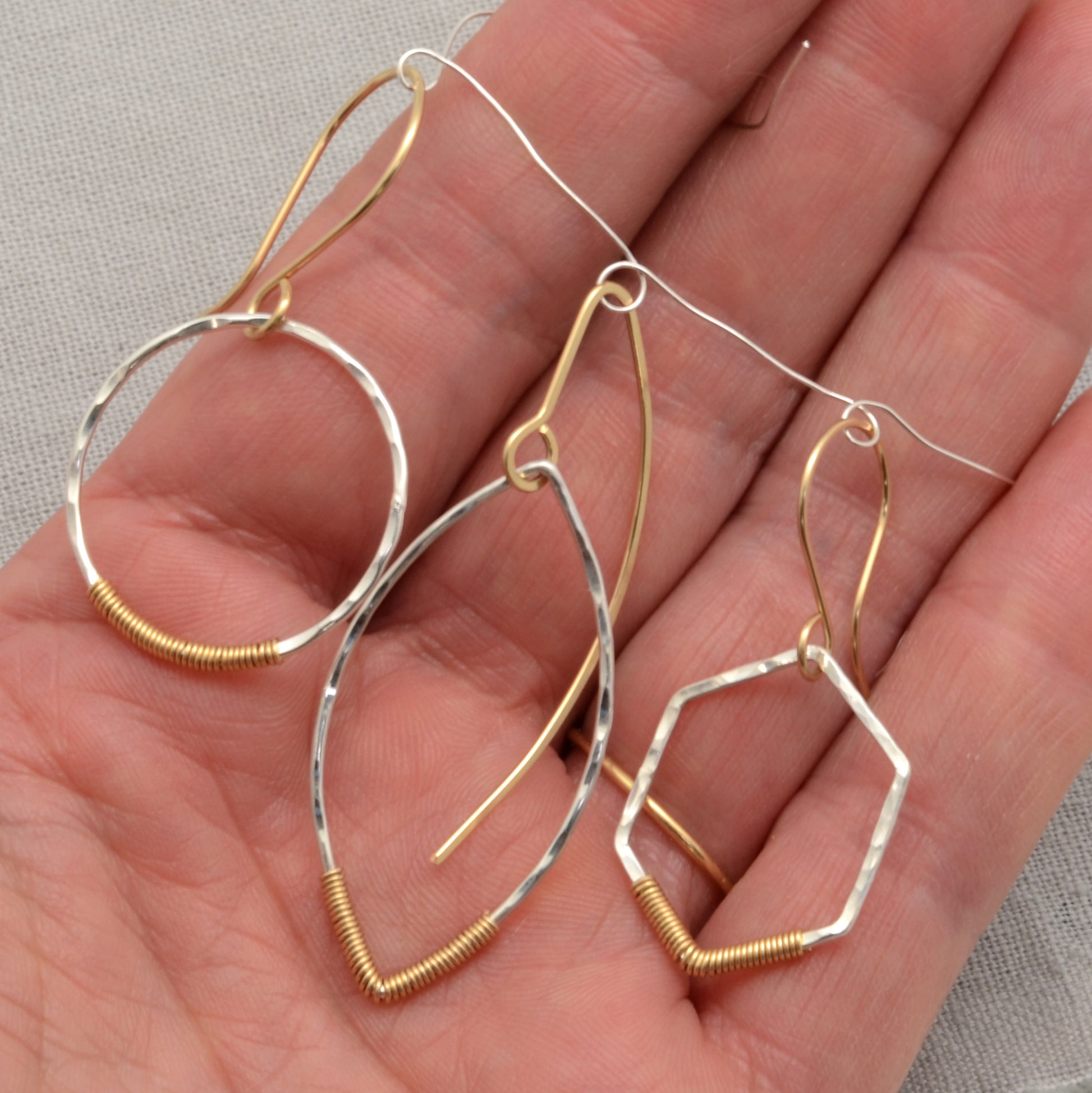 In our It's a Wrap collection, 14k Gold Filled wire is carefully coiled around hand-hammered hoops, pointed-ovals, tears, and hexagons, and each is paired with custom earwires.