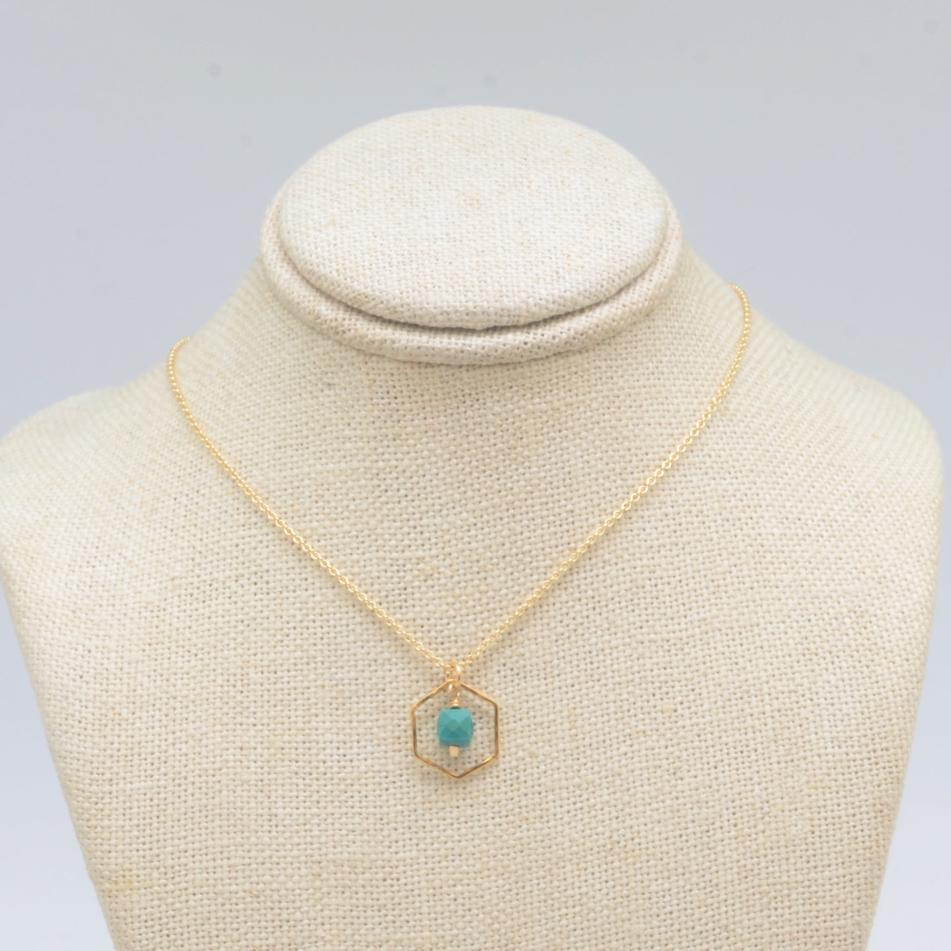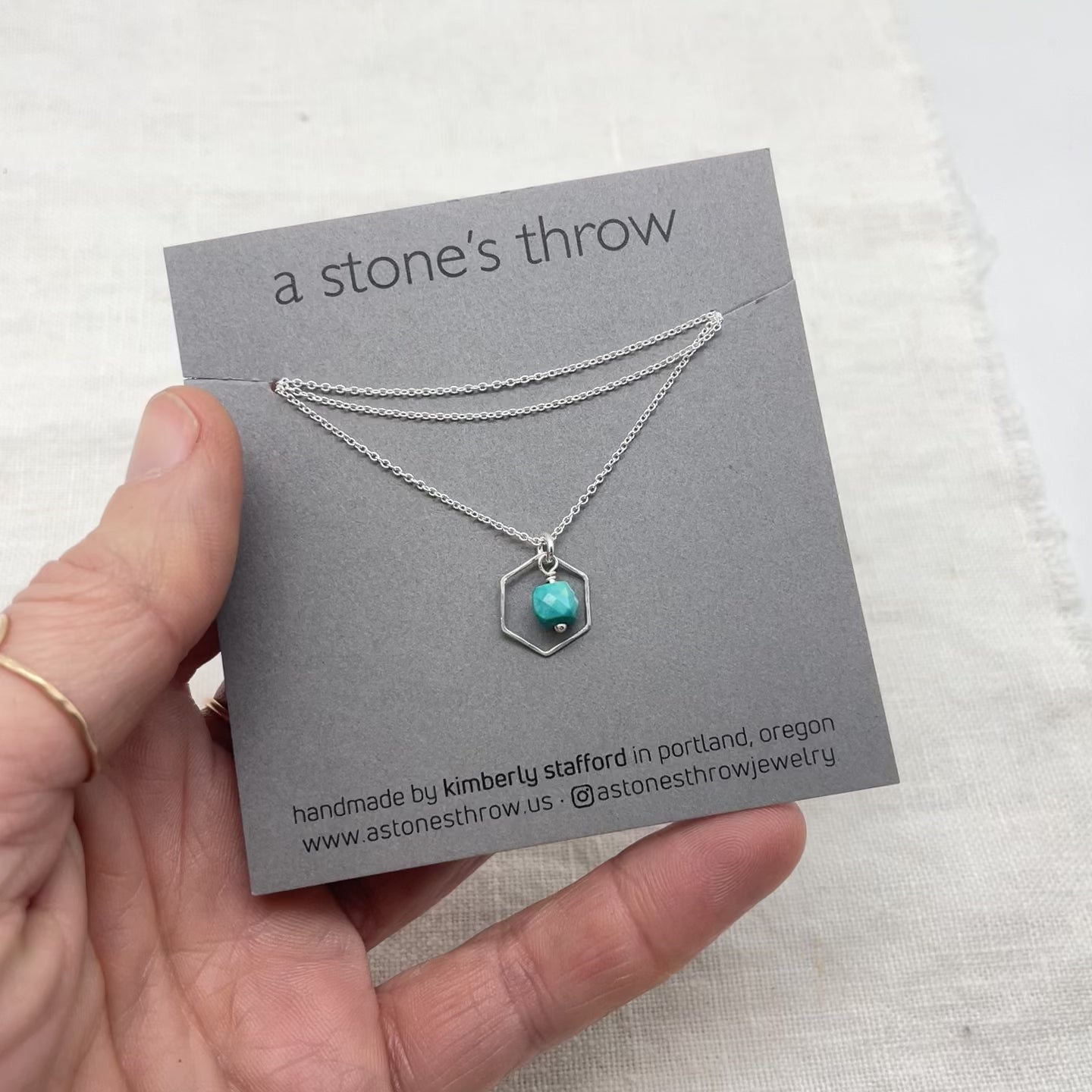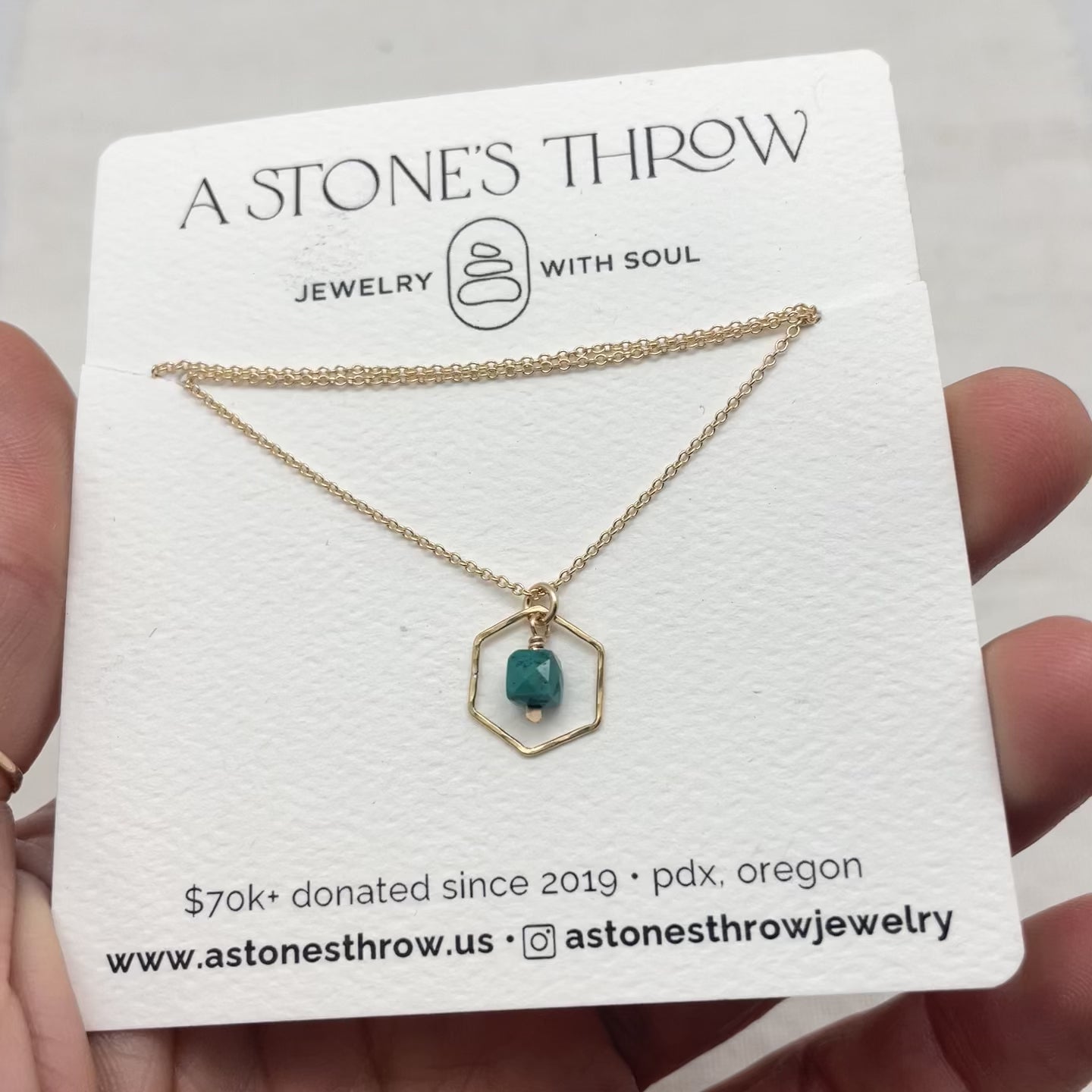 Originally inspired by a great friend of A Stone’s Throw, our Kara necklace features a wee drop, housed in a hand-formed + hand-hammered hexagon. For our LA Wildfires Fundraiser we chose Turquoise, because of its beachy vibes. (