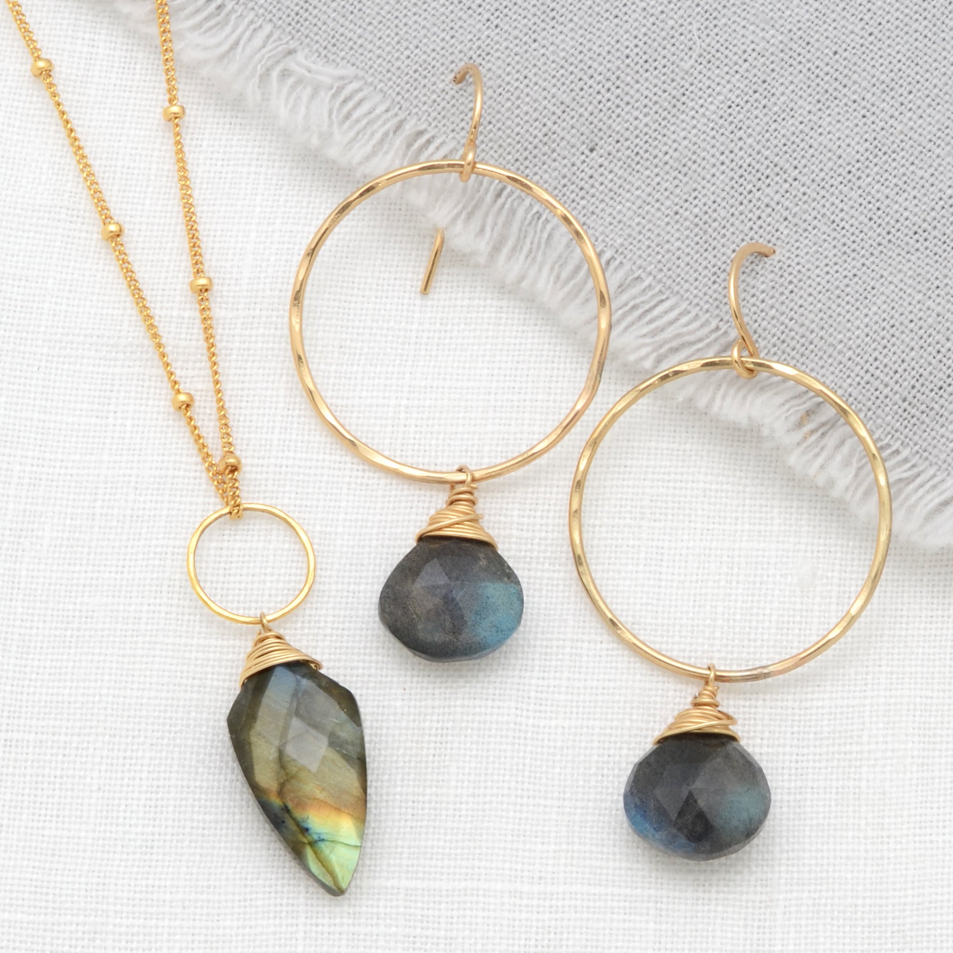 Labradorite is said to help impart strength & perseverance and is thought to be one of the most protective gemstones in the mineral world. Our Rockstars (originally made for a rockstar's wife, during Kimberly's time in Los Angeles), feature Faceted Labradorite Tears on hand-hammered 1" Hoops & our custom-made Low Swoop earwires.