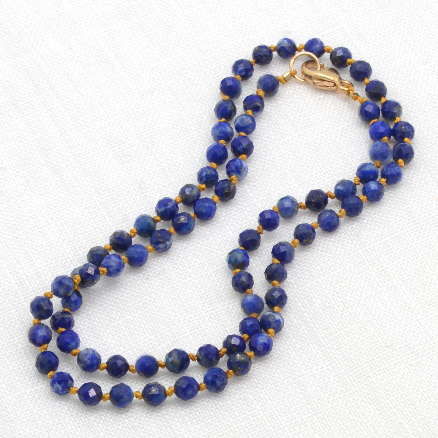 This 14" Convertible of Faceted Lapis Lazuli globes is hand-knotted on goldenrod-colored silk with 14k Gold Filled accents.