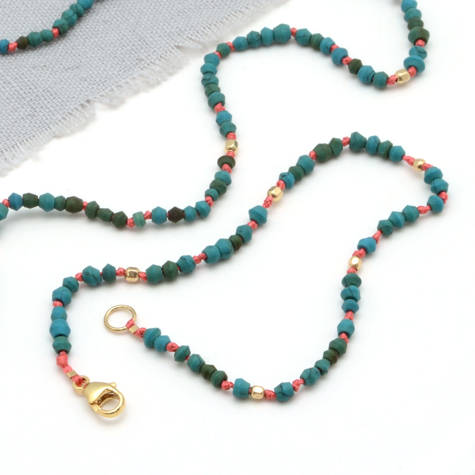 Have you every worn matte turquoise? The nice thing about matte gems is that they reflect less light, so their true colors can really come out. What we love about these hand-faceted turquoise is that each one has its own unique shape and hue of yummy blue-green. Knotted on bright coral silk and peppered with 14k Gold Filled beads for a little extra warmth and sparkle.