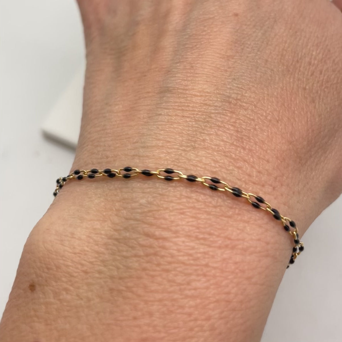 Our Jasmine bracelet offers a nice weight of 14k Gold Filled links accented with Black Enamel. It layers perfectly with our Warren, Un Abbraccio, or Barrel of Laughs bracelets.
