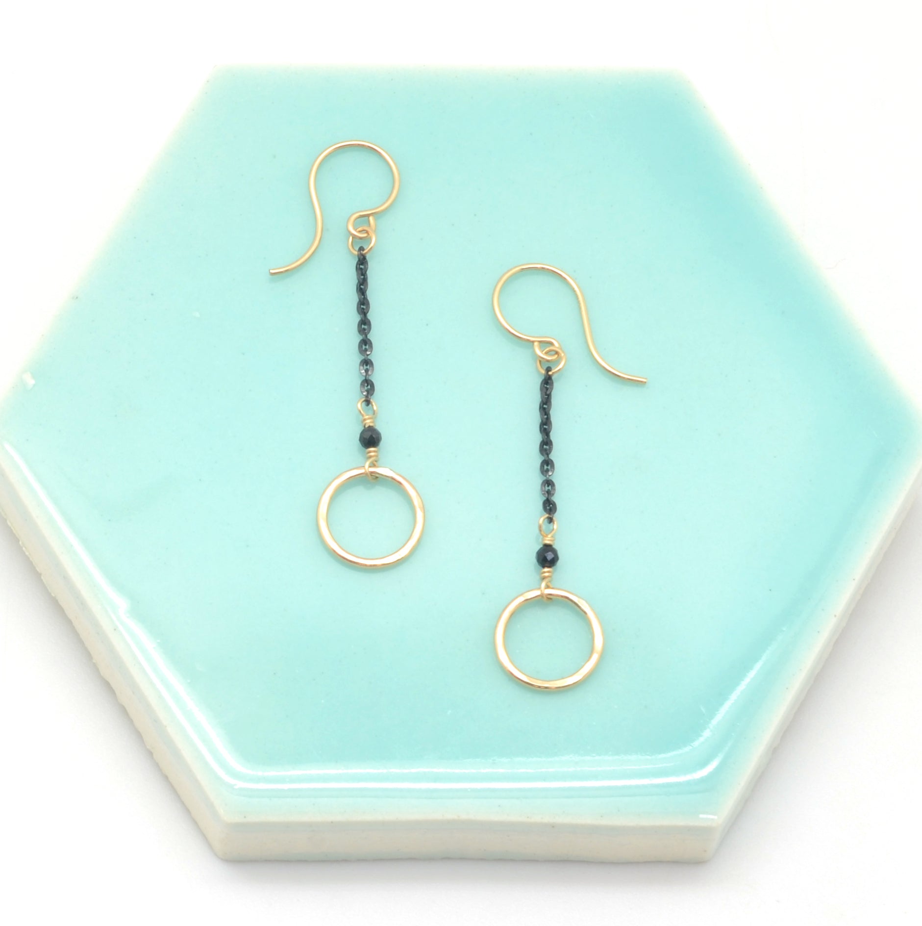 Hand-hammered 10mm circles in 14k Gold Fill, swing cheerfully from 5/8" of Oxidized chain, with little Black Spinel accents.