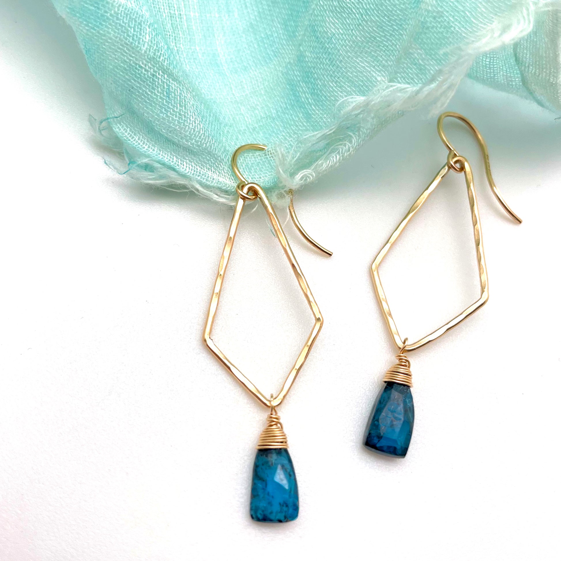 These unique Moss Kyanite earrings on 1" asymmetric kites, with a total drop from top to tear of 2". Limited quantity in stock and available in 14k Gold Filled or Sterling Silver.