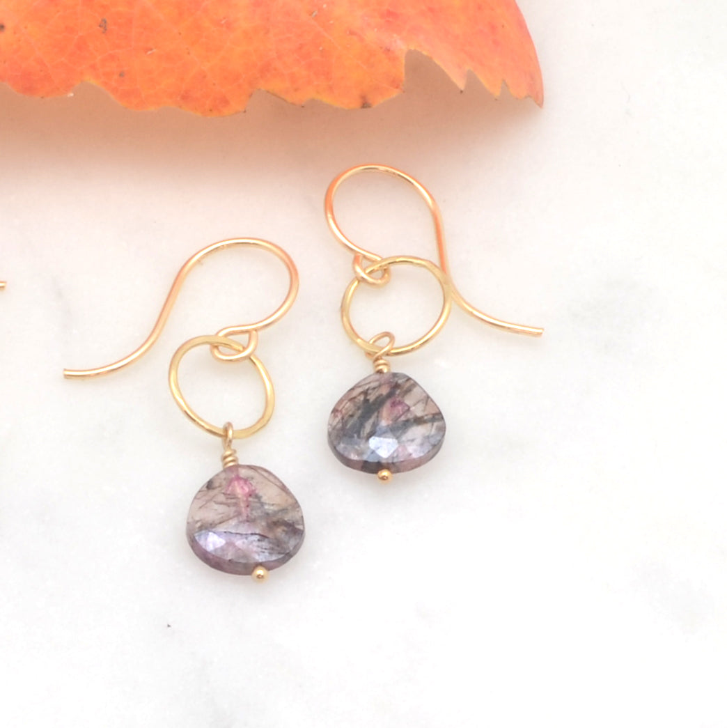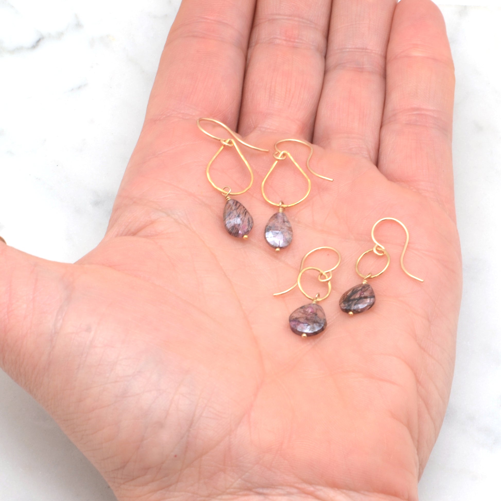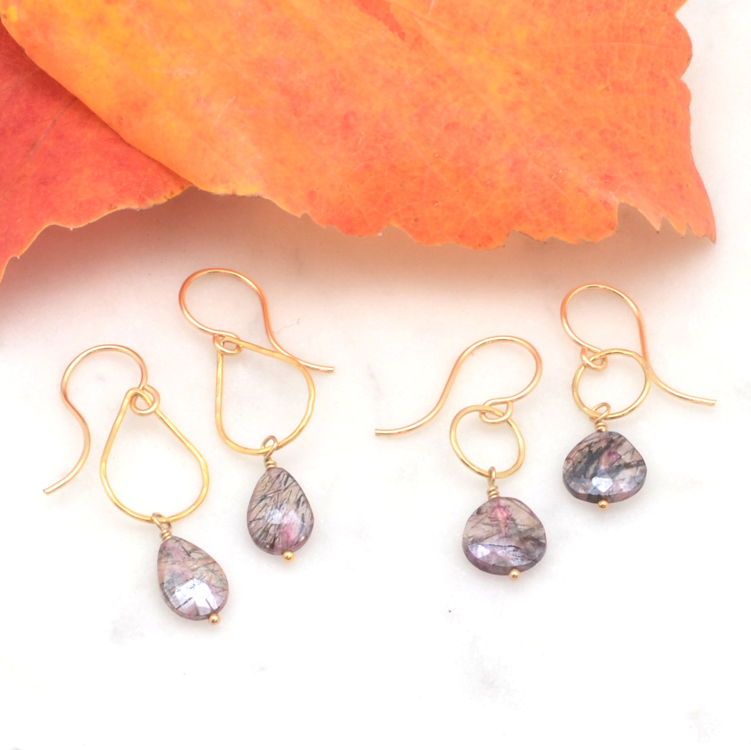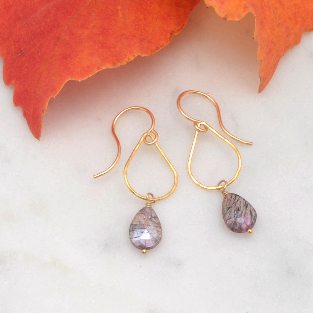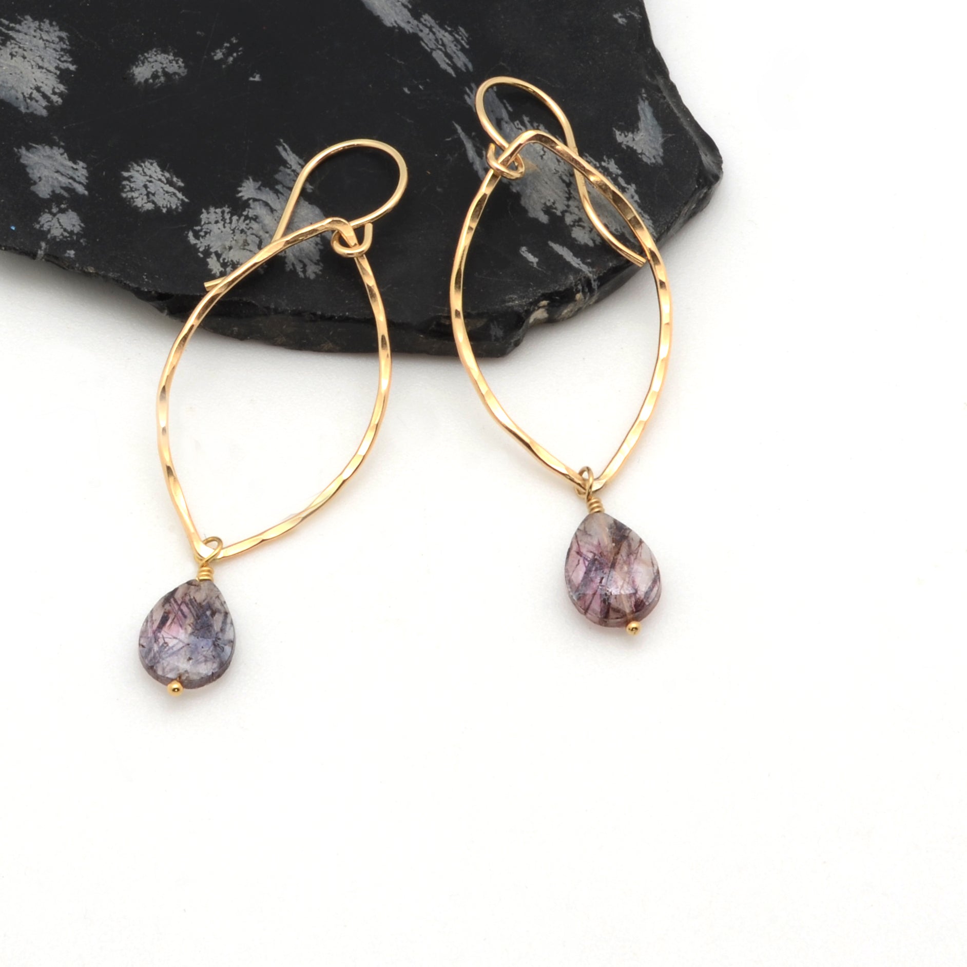 These Mystic Amethyst tears have deep plum inclusions and beautiful sparkle. Available on Hammered Tears, wee Hoops, or our Hammered Povals (largest option).
