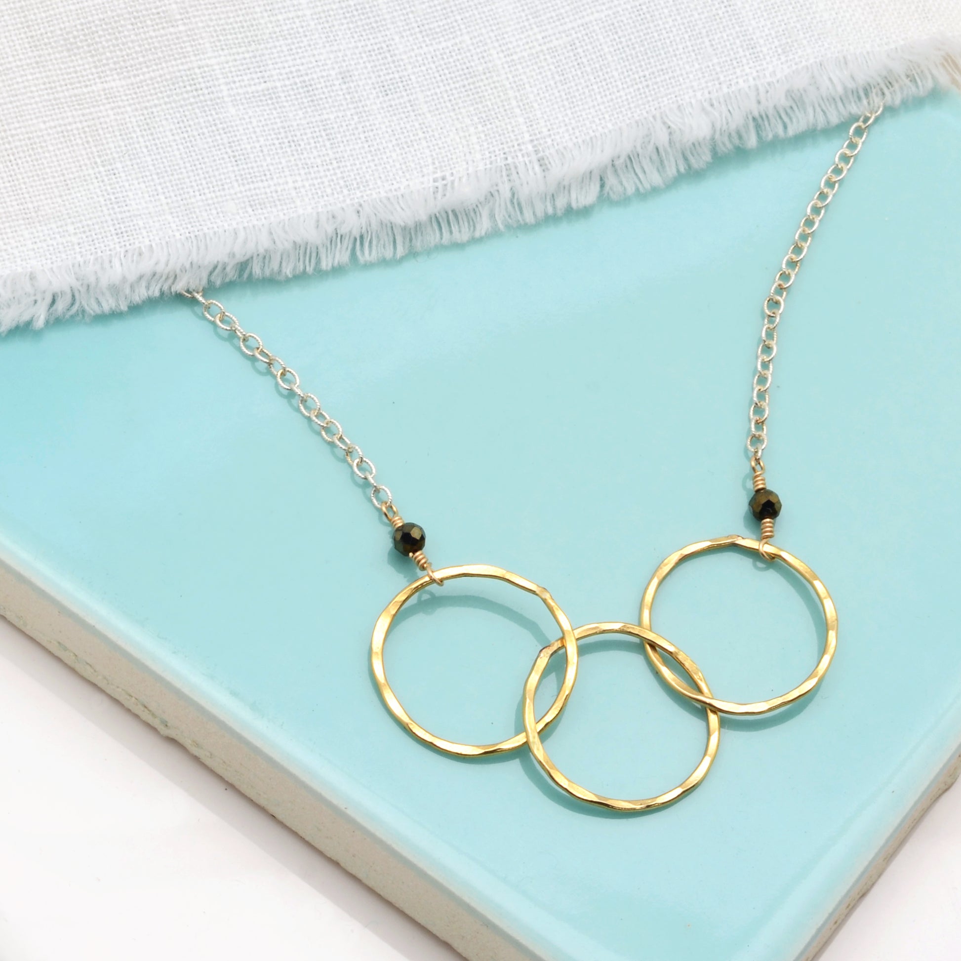 This is a bolder version of our Past, Present, Future Light necklace, with three 5/8Ó hand-hammered 14k Gold Filled Circles on a textured, matte sterling Silver Chain. Also available in all 14k Gold Filled.