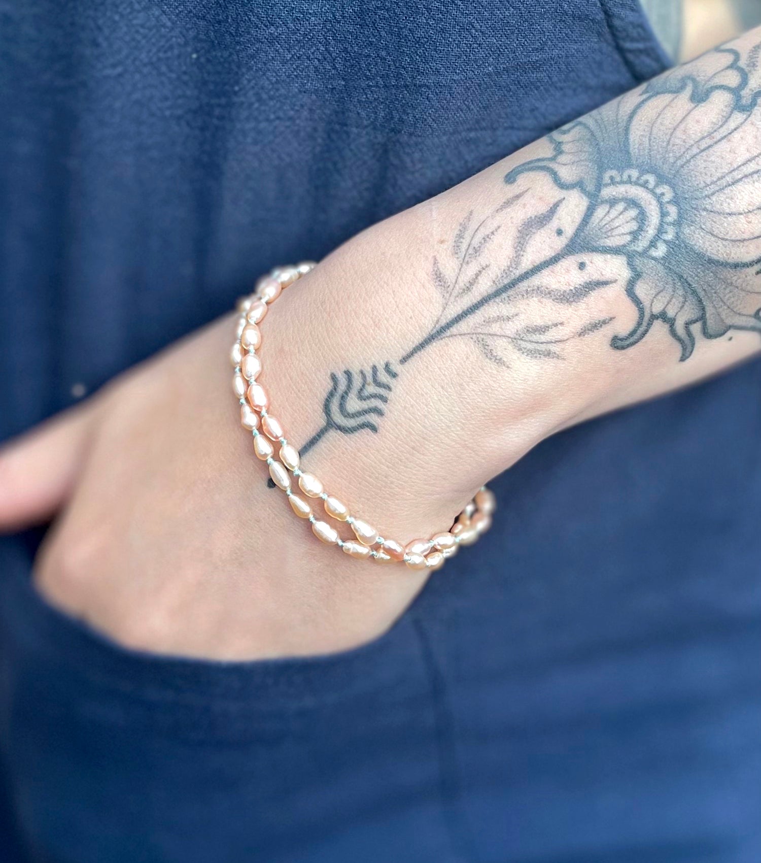 This 14" Convertible of Peach Keishi Pearls is hand-knotted on pale blue silk with 14k Gold Filled accents.