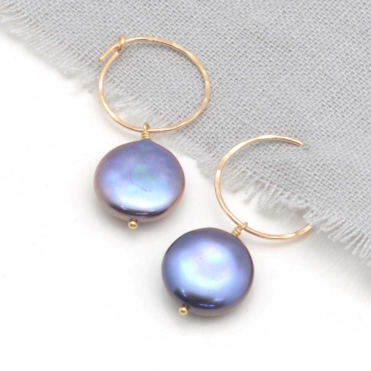 Peacock Coin Pearls on 5/8" Hand-Hammered Infinity Hoops.