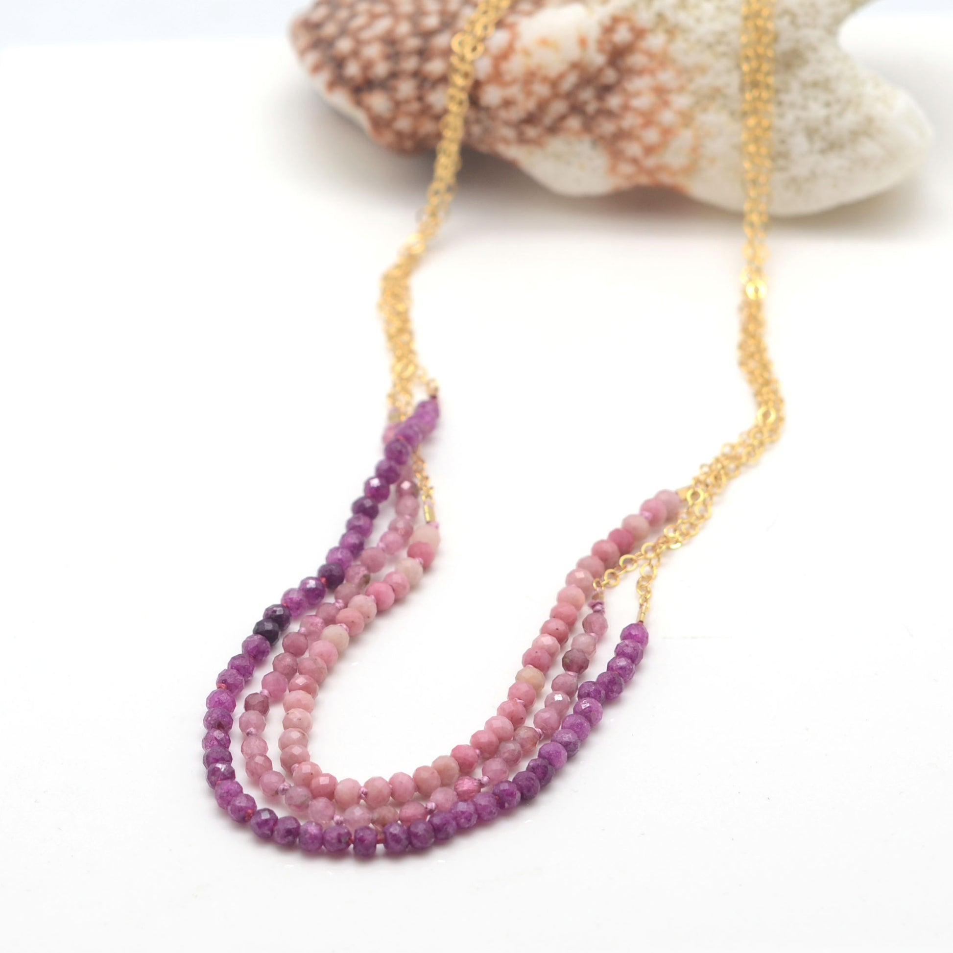 The first version born on that trip was with minty green Moonstone which was warmly received, so more color pallets of this style have followed. This piece is for the July and October babies out there, featuring Ruby (July), Tourmaline (October), + Rhodochrosite