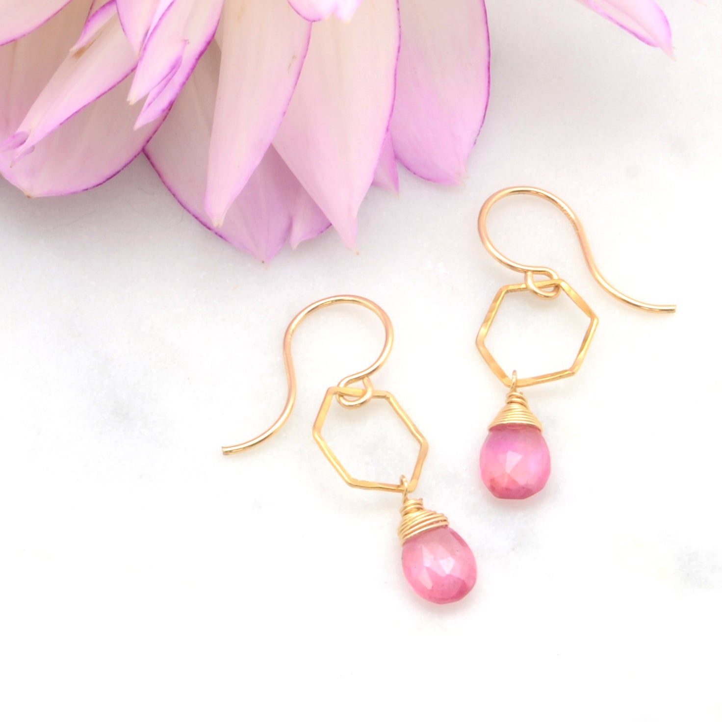 Bright Pink Sapphire Tears on Hand-Hammered 14k Gold Filled or Sterling Silver Hexagons.