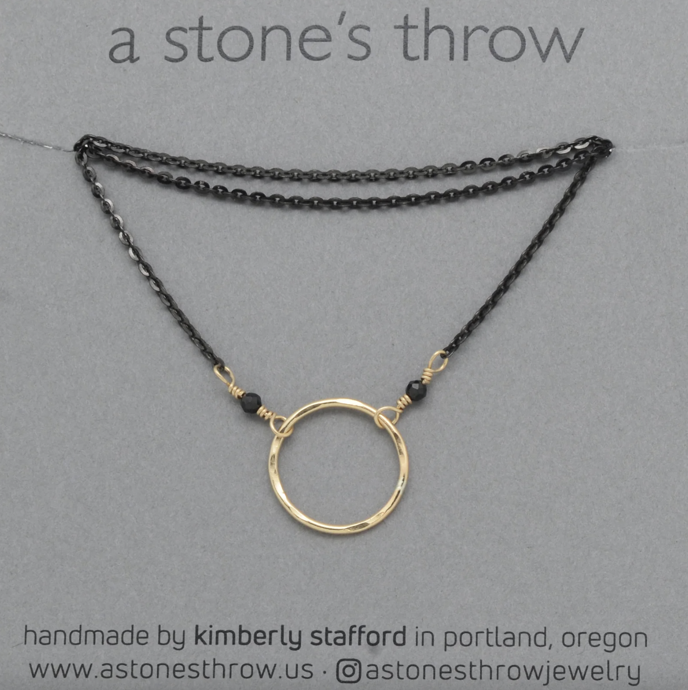 This is my everyday necklace! If you catch me a jewelry event, there's a 90% chance this is what I'm wearing, since I actually never take it off... I sleep, shower, and exercise in this lil' lady. The blackened chain is a Sterling Silver faceted chain that has been oxidized and lacquered in the factory, which makes the rich dark patina super durable. I love the contrast of the dark chain to the hand-hammered 14k Gold Filled 5/8" circle. Black Spinel accents.