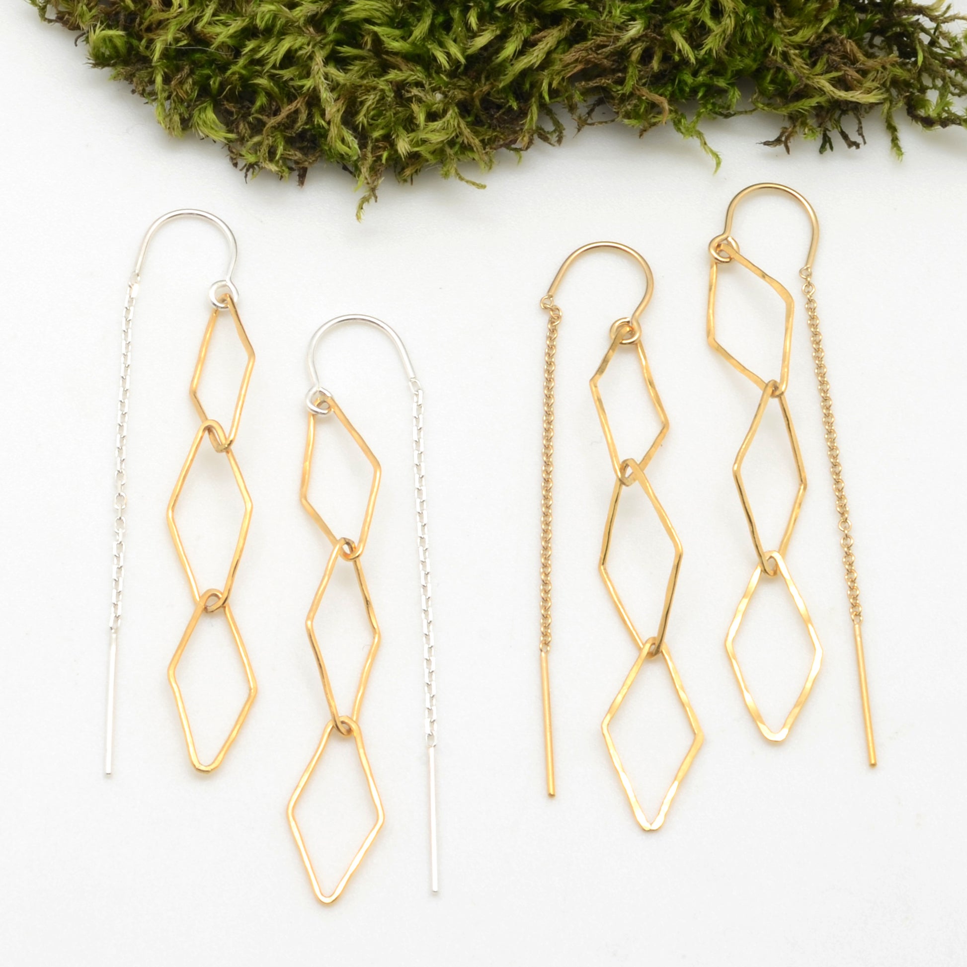 Three hand-formed 14k Gold Filled Kites fall 2.25" on your choice of 14k Gold Filled or Sterling Silver Threader Earwires. The chain at the back offers an elegant extra dimension to these geometric beauties.
