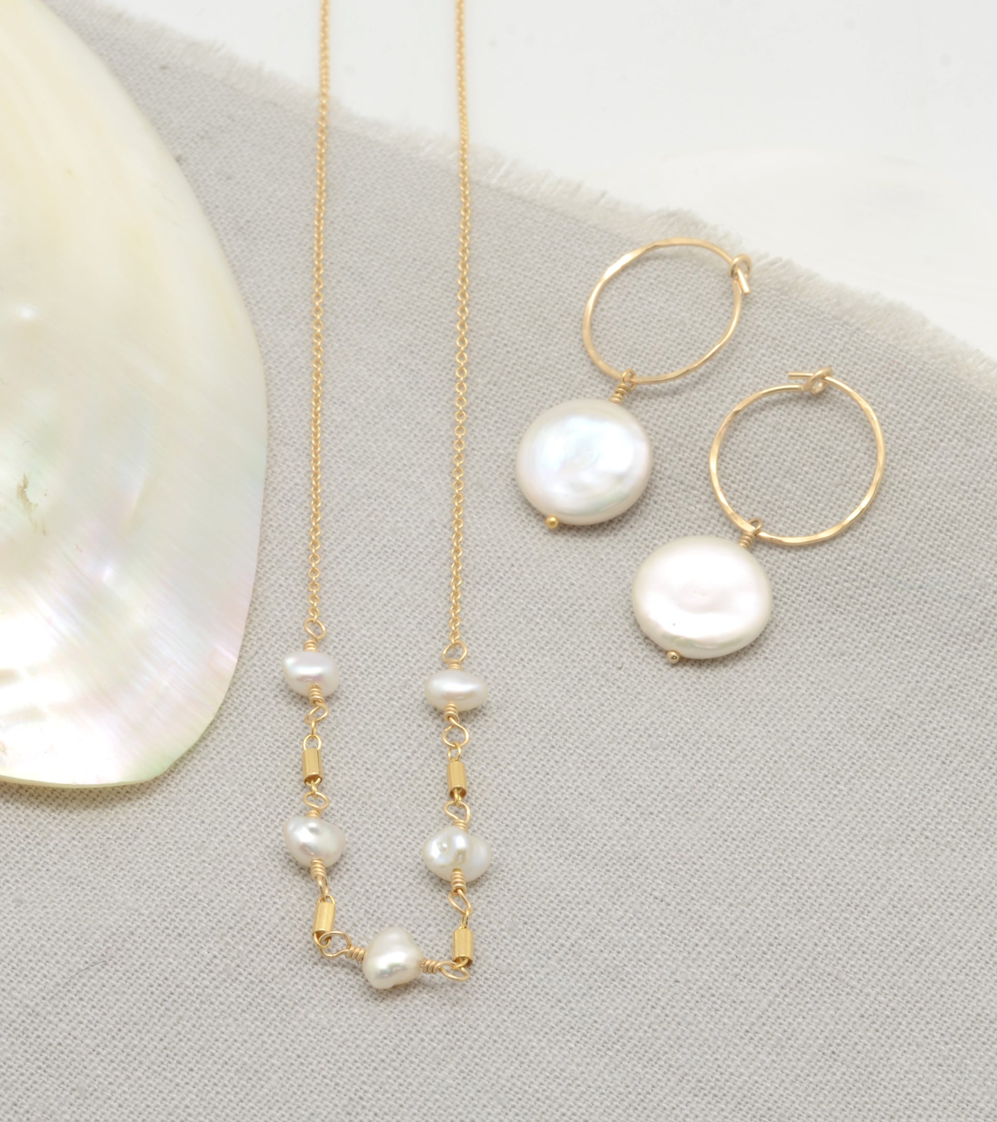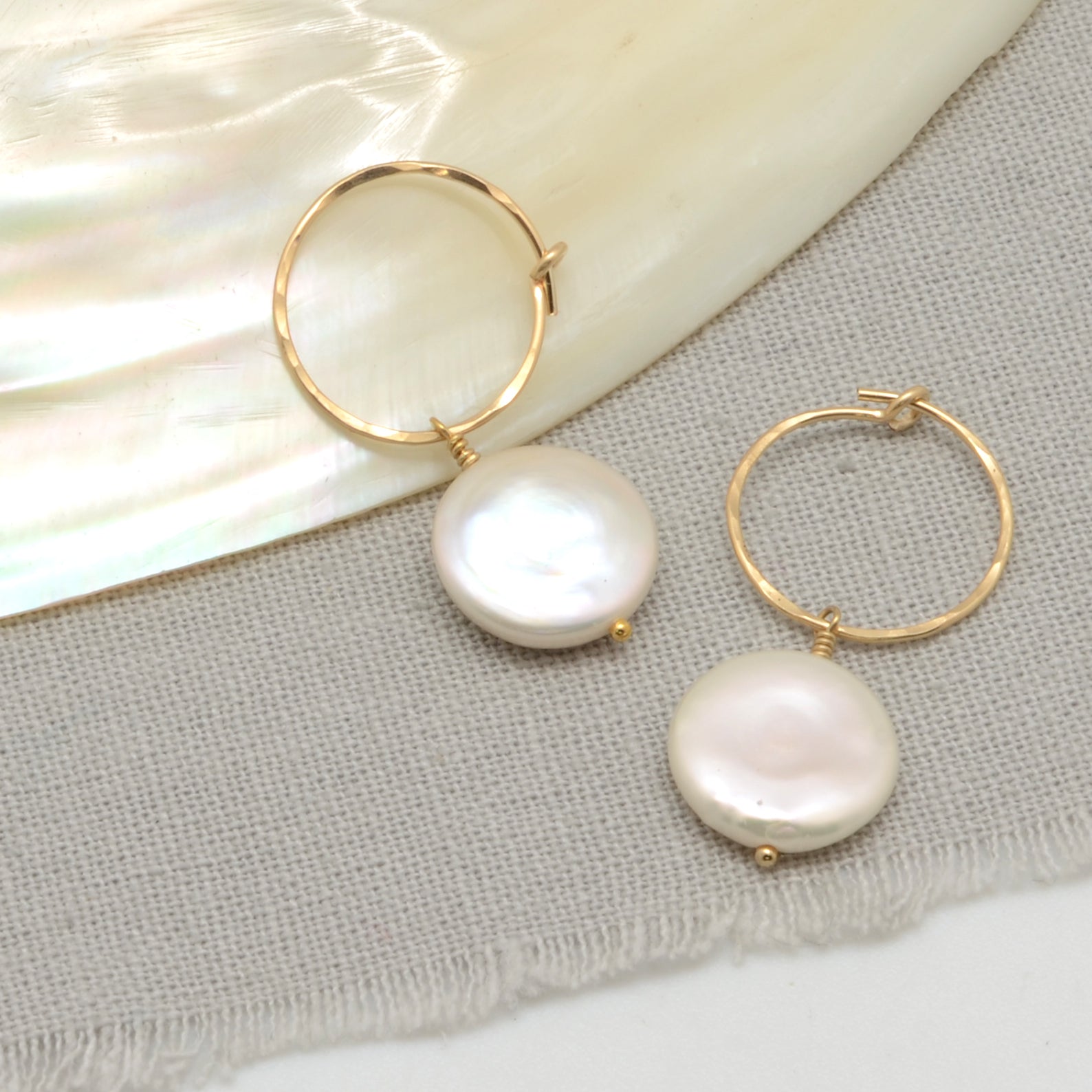 These White Coin Pearls on Hand-Hammered 14k Gold Filled 5/8" Infinity Hoops blend traditional gold hoops with classic white pearls to create a look that will always be fresh and relevant.