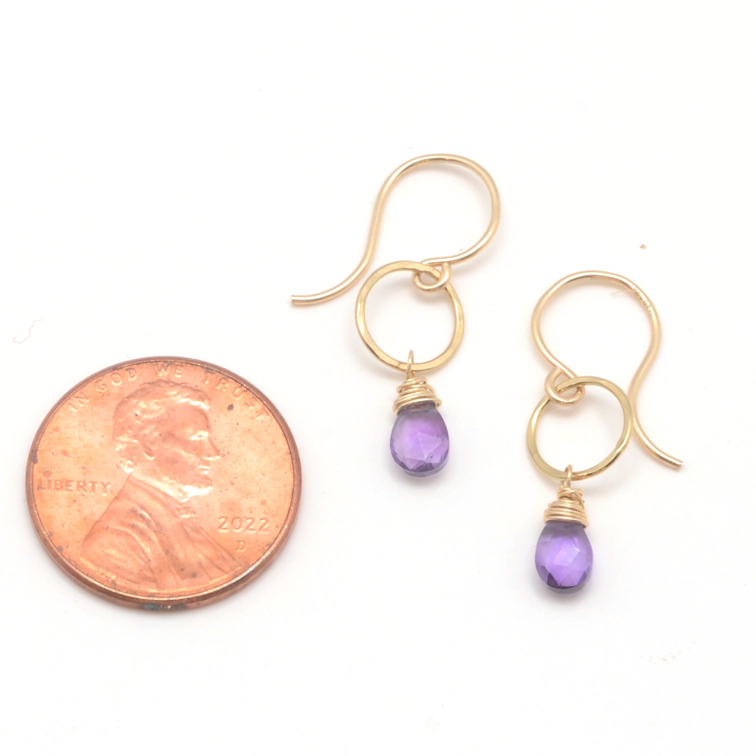 Deep Purple cones of Purple Amethyst set on wee hand-hammered 14k Gold Filled or Sterling circles. A cut little splash of color in a demure little package. (Penny in there for scale).
