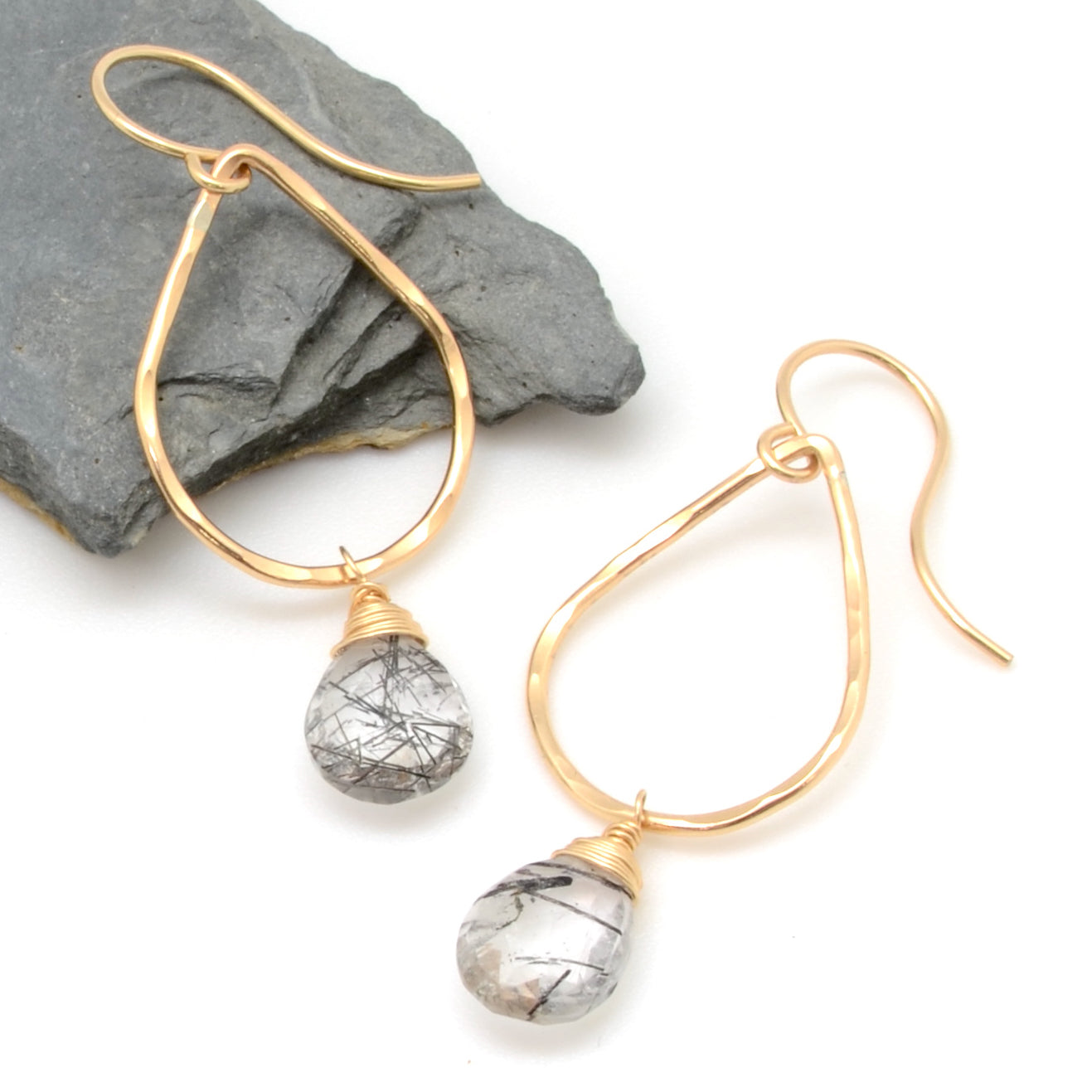 These Tourmalated Quartz Tears are a clear quartz tear, with inclusions of Black Tourmaline fibers. We've set them on hand-hammered 14k Gold Filled 3/4" tears & earwires. No two pairs are exactly alike, but every pair is STRIKING!